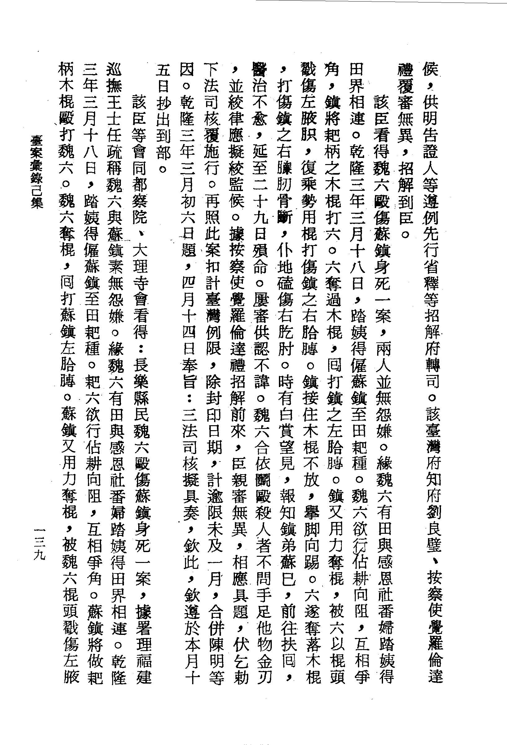 乾隆三年三月十八日,踏姨得僱蘇鎮至田耙種。耙六欲行佔耕向阻,互相爭角。蘇鎮將做耙柄木棍毆打魏六。魏六奪棍,回打蘇鎮左月合膞。蘇鎮又用力奪棍,被魏六棍頭戳傷左腋胑,復乘勢用棍打傷蘇鎮右月合膞。蘇鎮接住木棍不放,舉腳向踢。魏六奪落木棍,打傷蘇鎮右膁肕骨斷,仆地磕傷右肐肘。時有白賞望見,報知蘇鎮之弟蘇巳,前往扶回,醫治不愈,越十日殞命。
