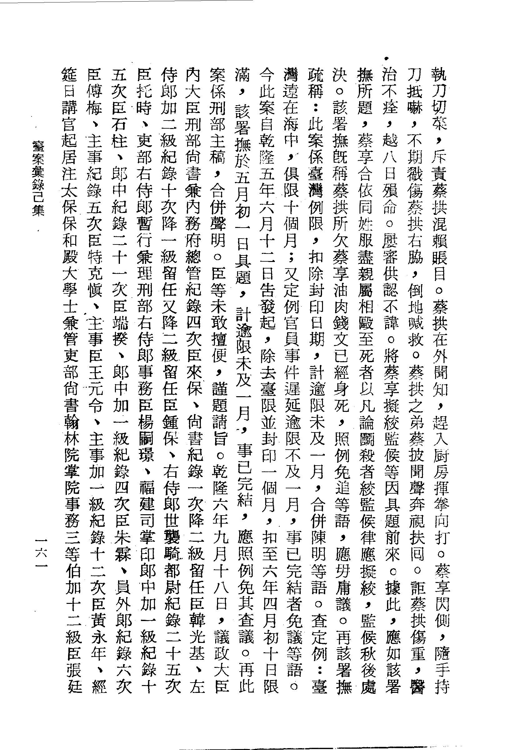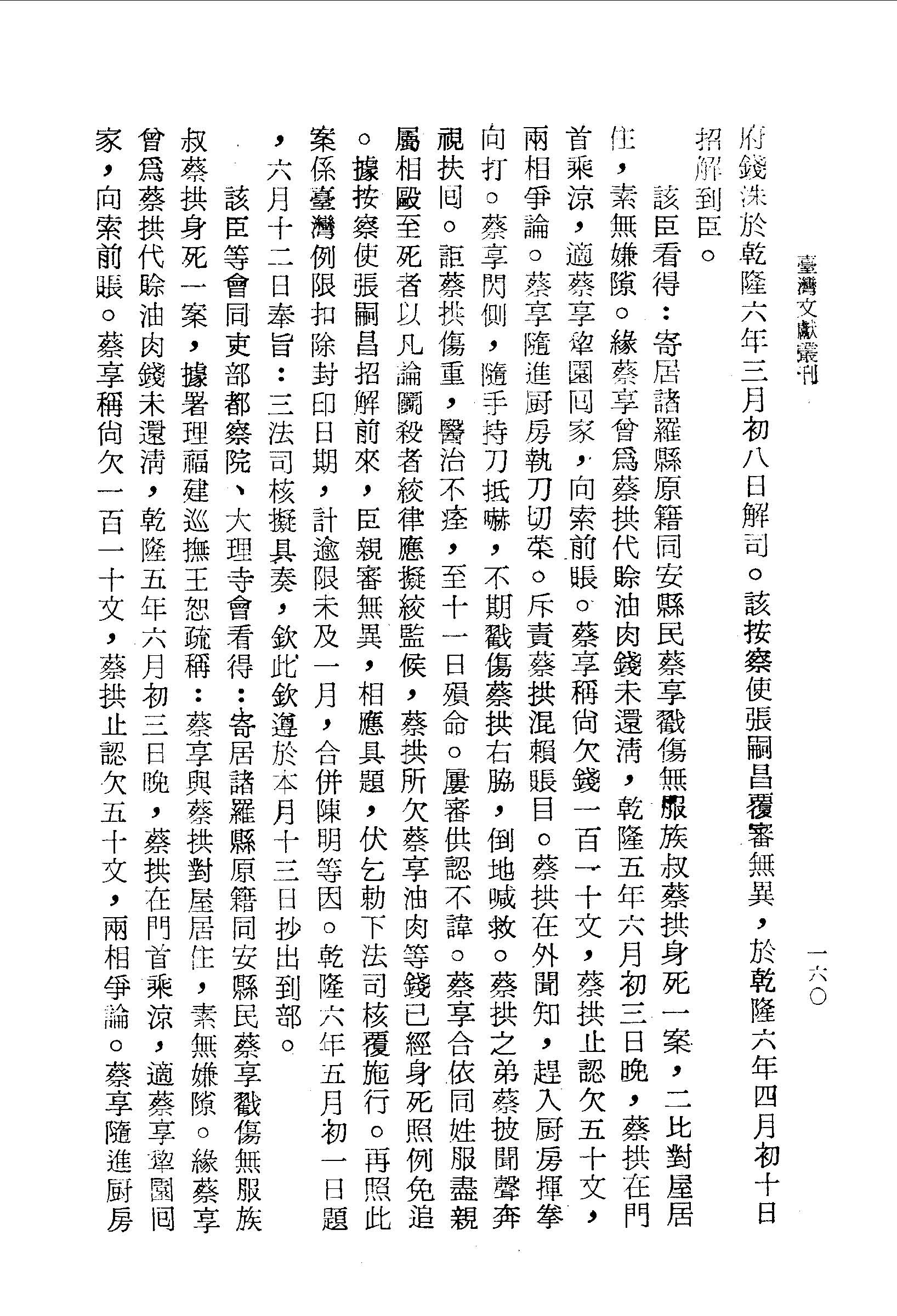 緣蔡享曾為蔡拱代賒油肉錢未還清,乾隆五年六月初三日晚,蔡拱在門首乘涼,適蔡享犁園回家,向索前賬。蔡享稱尚欠一百一十文,蔡拱止認欠五十文,兩相爭論。蔡享隨進廚房執刀切菜,斥責蔡拱混賴賬目。蔡拱在外聞知,趕入廚房揮拳向打。蔡享閃側,隨手持刀抵嚇,不期戳傷蔡拱右脇,倒地喊救。蔡拱之弟蔡披聞聲奔視扶回。詎蔡拱傷重,醫治不痊,越八日殞命。