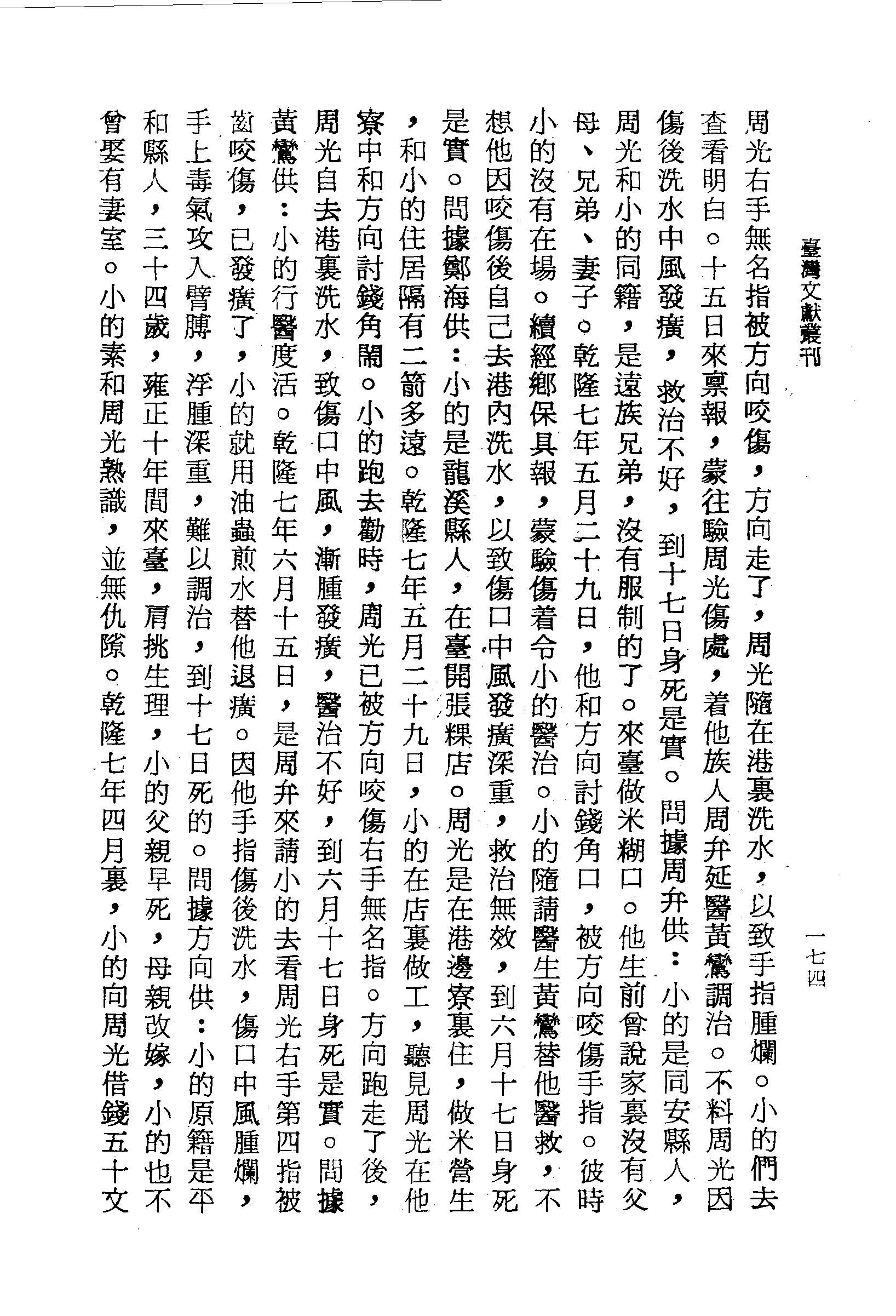 乾隆七年五月二十九日,他和方向為何事起衅咬傷周光手指,小的們住家離遠,原不知道。到六月十四日,小的們纔聽得人說,周光借給方向錢五十文。五月二十九日,和方向取討無還,兩人角口。周光右手無名指被方向咬傷,方向走了,周光隨在港裏洗水,以致手指腫爛。小的們去查看明白。十五日來稟報,蒙往驗周光傷處,著他族人周弁延醫黃鸞調治。不料周光因傷後洗水中風發廣,救治不好,到十七日身死是實。