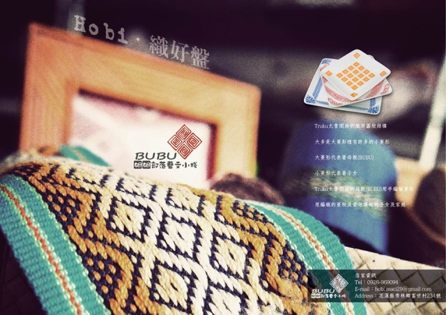 「守護之窗‧祖靈之眼」世世代代守護、監督著太魯閣的族人,菱形是太魯閣族最具代表性的紋樣,菱形就像是祖靈的眼睛,呈現在編織上庇護著後代子孫,在我19歲那年,叔公將叔婆留下的傳統織布機,用傳統手織被單包裹綁好親手交給我說:這是留給妳的,將來你一定用的到。故事是由人的心所說出來的,對這項傳統技藝的投入,給予這樣的物品賦予故事性,我們都看得到這些是有賦予傳承意念的物品,每項都是獨一無二的。我們始終堅持用手工的方式保存我們的文化,在織布機上用一捲一捲的線來傳承屬於太魯閣族的文化與歷史,我們在織布機上面描寫了故事、保存了傳統、留下了作品。
