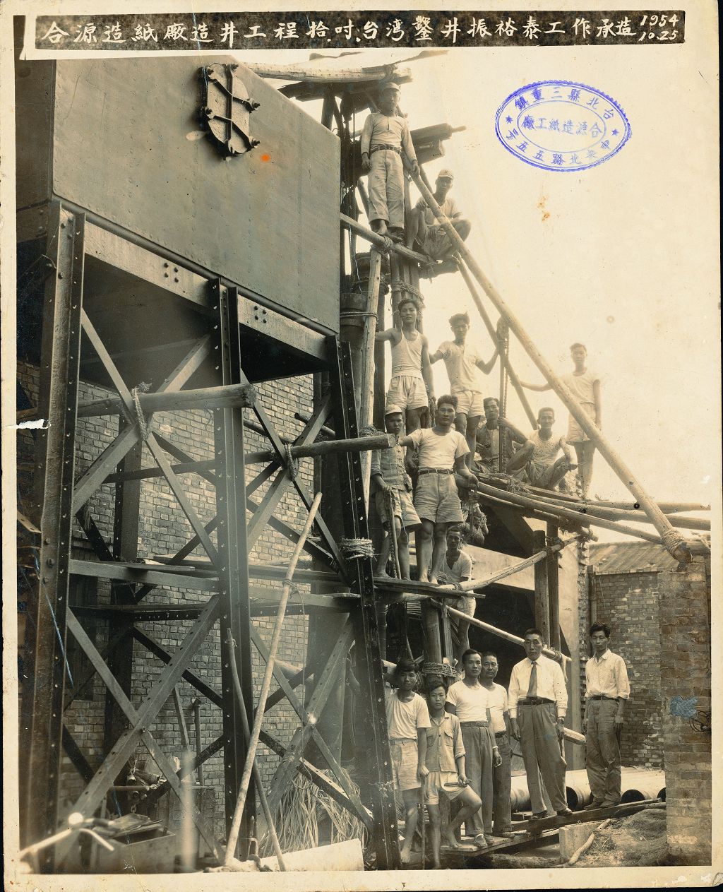 圖民國43年(1954)10月25日拍照,合源紙廠造井工程10吋,造井抽水製紙,由台灣鑿井振泰工作承造,前排右二繫領帶者為合源老版蔡戲之二弟。日治時期著名的「蔡合源造紙工業所」名氣便響叮噹,它是早期台灣文化界人士耳熟能詳的老牌紙廠,「合源製紙」工廠設立於昭和15年(1940),生產「土報紙、包裝紙」,職員3人、工人30人,紙廠內曾設員工宿舍,是早年台灣北部最大的紙廠,「合源製紙」工廠由蔡戲兄弟蔡水木接管,該廠共計約40年輝煌的紙業王國事業。位於三重市中央北路55號的該廠面積約2000坪,斜對面廠房則是知名的60號中央印製廠,在當時中央印製廠處理打孔後的廢棄新台幣紙鈔,源源不斷地提供該廠「煮」製成造紙源料,據該廠郭榮昌領班表示,其時該廠以生產土報紙、包裝紙與銅光紙等為主。該廠生意很好,每年紙張都銷售一空;早期該廠利用竹、稻、甘蔗渣等製作紙材,尤其大量從台灣中南部購買運來的甘蔗渣是製紙材料的主要來源,製造出纖維紙、粗製紙等。常常地,該廠員工分二班制輪作,一班12小時,若是碰到溽暑,紙廠工作環境酷熱,員工工作很辛苦,盛夏時滾輪和燒爐溫度很高,整個紙廠內熱烘烘。