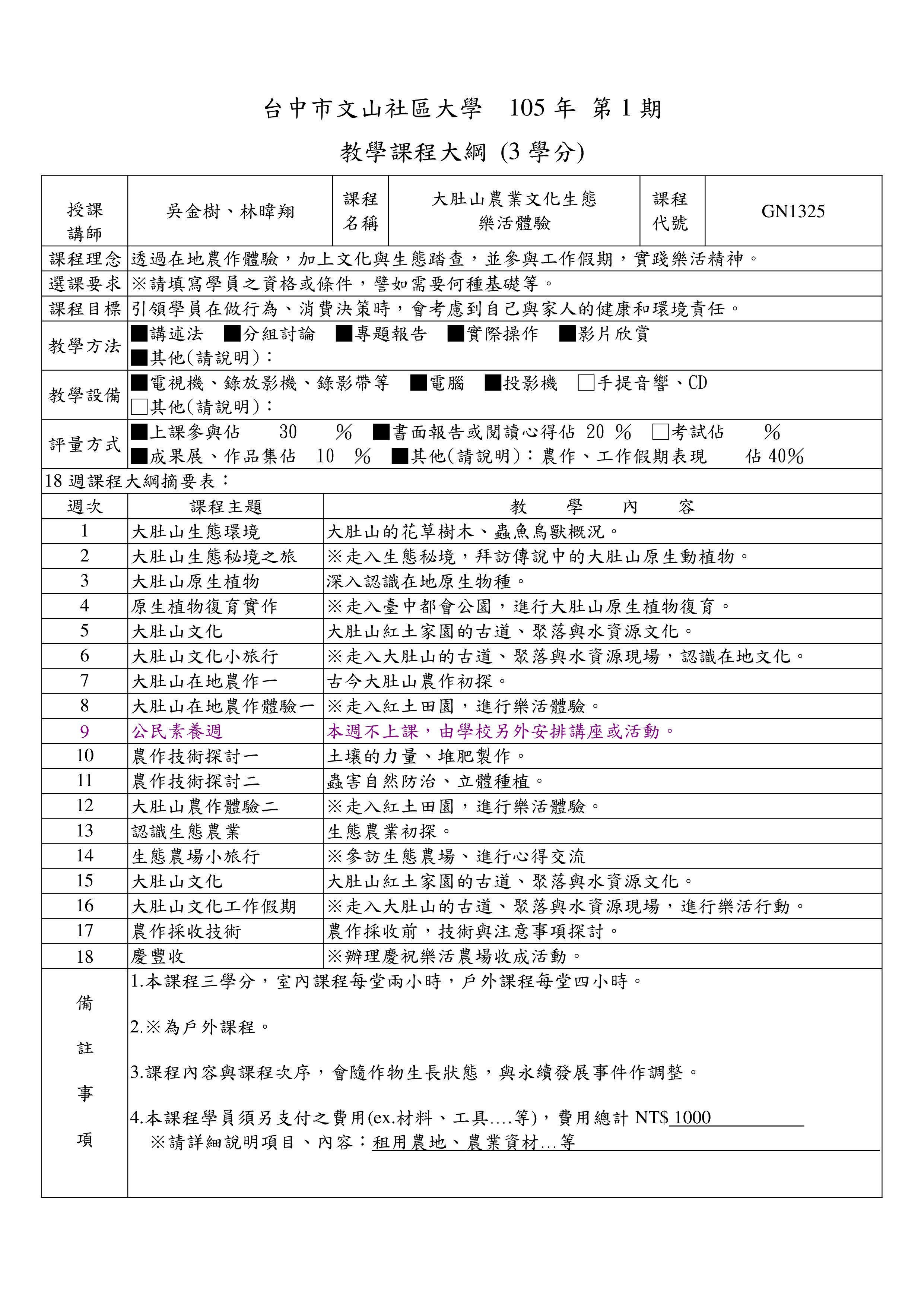 照片為『大肚山農業文化生態樂活體驗』課程大綱,本課程透過在地農作體驗,加上文化與生態踏查,並參與工作假期,實踐樂活精神。並引領學員在做行為、消費決策時,會考慮到自己與家人的健康和環境責任。