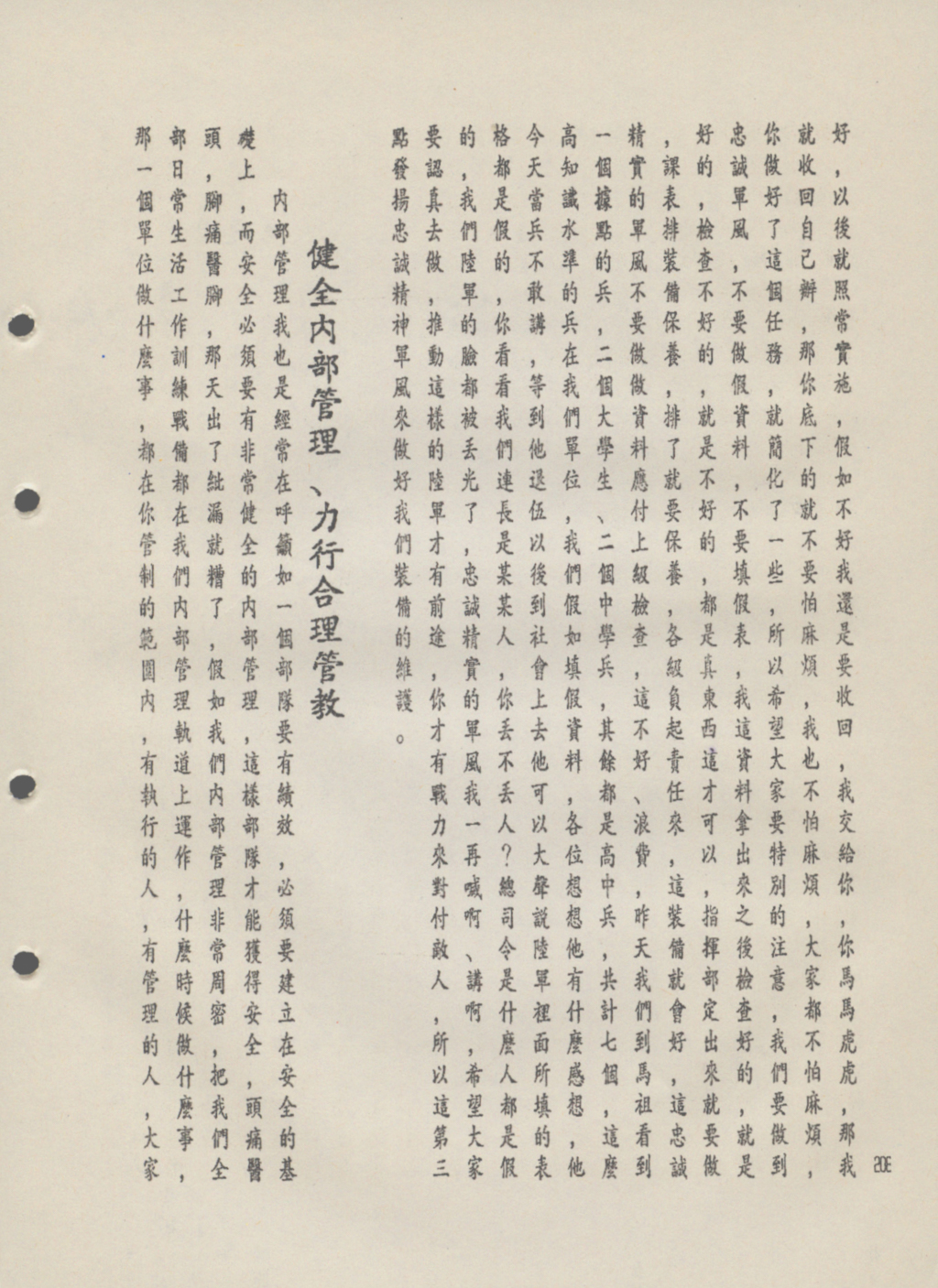 「昨天我們到馬祖看到一個據點的兵,兩個大學生、兩個中學兵、其他都是高中兵,總共七個。這個高知識水準的兵在我單位,假如填寫假資料,各位思考他們做何感想?今天當兵沒講,以後退伍到社會上去可以大聲說陸軍裡面所填寫的表都是假的,你看我們連長是某人?你說這樣丟不丟人?總司令是什麼人?填的表都是假的,我們陸軍的臉都被丟光,忠誠精實的軍風一再講,希望大家認真執行,這樣推動陸軍才有前途,才有戰力對付敵人,所以請務必記得。」