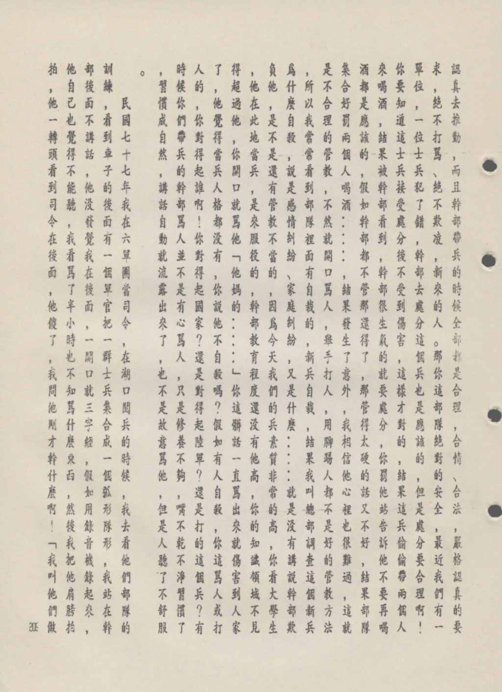 「我常常看見部隊裡面有自裁,新兵自裁,要總部去調查原因,說是感情糾紛、家庭因素,但都沒提到幹部欺負他、管教不當。新兵的素質非常高,你看大學生,他們是在此地當兵,是來服役的,幹部的教育程度還沒有他高,你的知識領域也不見得贏得過他,可以開口就罵他「他媽的…」這話一說出口就傷害到別人了,他覺得當兵人格都沒有,他說他能不自殺嗎?假如他自殺了,你這樣對得起誰?你對得起國家?還是陸軍?還是被你欺負的兵?有時你們罵人本意,就只是修養不夠,嘴巴乾淨習慣了,習慣成自然,也並非本意,但就是使人聽了不舒服。」