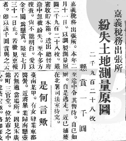 1926年的6月10日,《臺灣日日新報》出現了一則短短的啟事,寫著嘉義稅務出張所在2月21日的時候,遺失了用木箱裝存、謹慎密封的地圖,其數量竟高達2928張,啟事中同時言明,凡是提供線索的人,以一千圓重金懸賞。當時臺灣大眾所吃的是未脫去糠層與胚的玄米(即糙米),而每百斤糙米躉售價約24.93圓,也就是說,一千圓可以買到四千斤玄米,這麼多的錢,可以說是百萬懸賞也不為過。