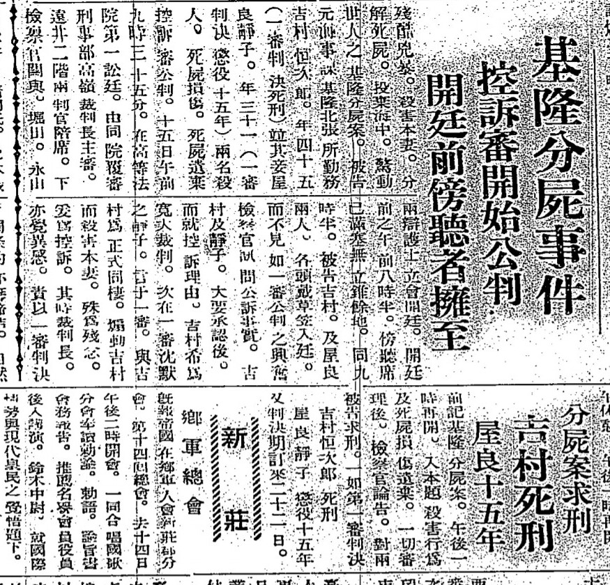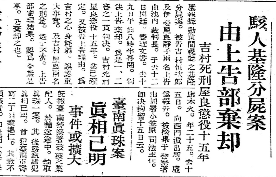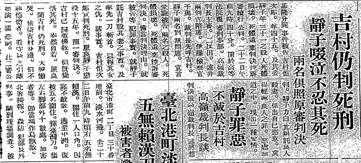 吉村恆次郎於1934年11月6日被捕,震驚全島。《臺南新報》記載:被告人尤其是堂堂臺灣總督府交通局官吏,大為世人所注目,屆時開廷(庭),遠近好奇者,必以千計,擁擠於公廷。裁判長有鑑及此,雖不能禁止旁聽,亦當有以制限之,決定發行旁聽券,以防雜沓。審判結果吉村恆次郎被判處死刑,屋良靜則被判處十五年徒刑。