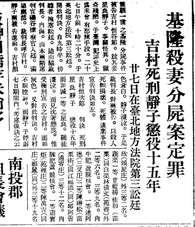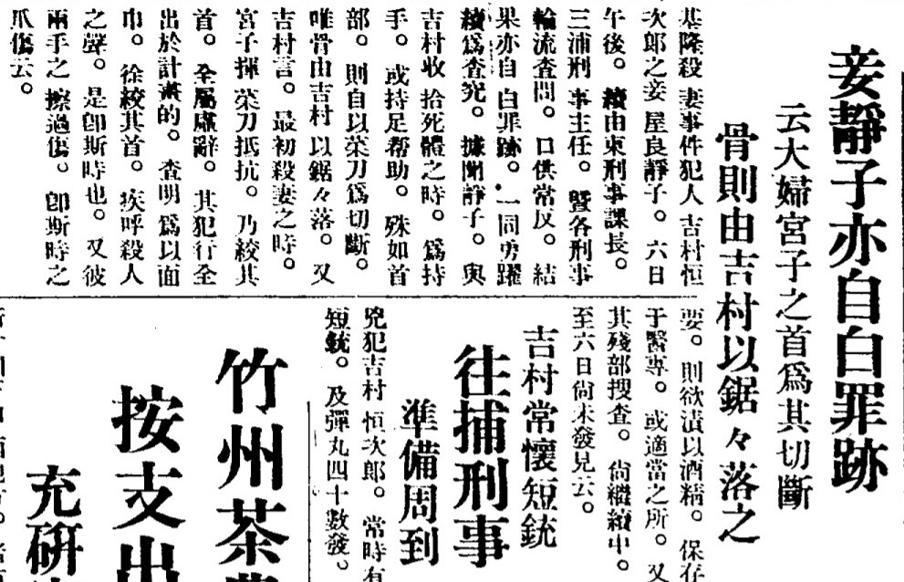 1934年(昭和九年),臺灣總督府交通局基隆海事課出張所書記兼技手吉村恆次郎之妻宮氏失蹤。警方主動展開偵查,吉村表示宮氏回日本老家,警方卻認為事有蹊蹺。