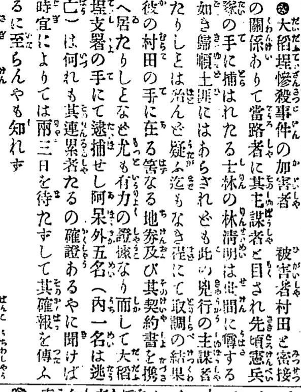 1908年2月8日,警方逮捕住在稻仔園坑(今新北市新店青潭一帶)的男子高斤,因其持有被殺的村田賢吉的物品──懷錶一枚與望遠鏡一個。高斤供稱他只是從犯,主謀是也住在稻仔園的苦力頭黃乾元。同月22日,由檢察官松井、法官川上等人開始審理此案。高斤遭判死刑。
