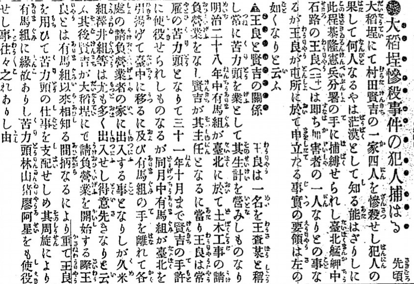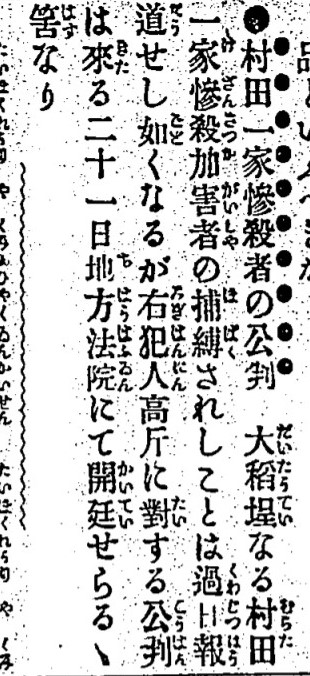 1901年4月16日,38歲的村田賢吉與懷孕中的妻子戎谷敦、兩名友人市川太一郎和北貞造遭到殺害,女傭阿欽為第一發現者。
