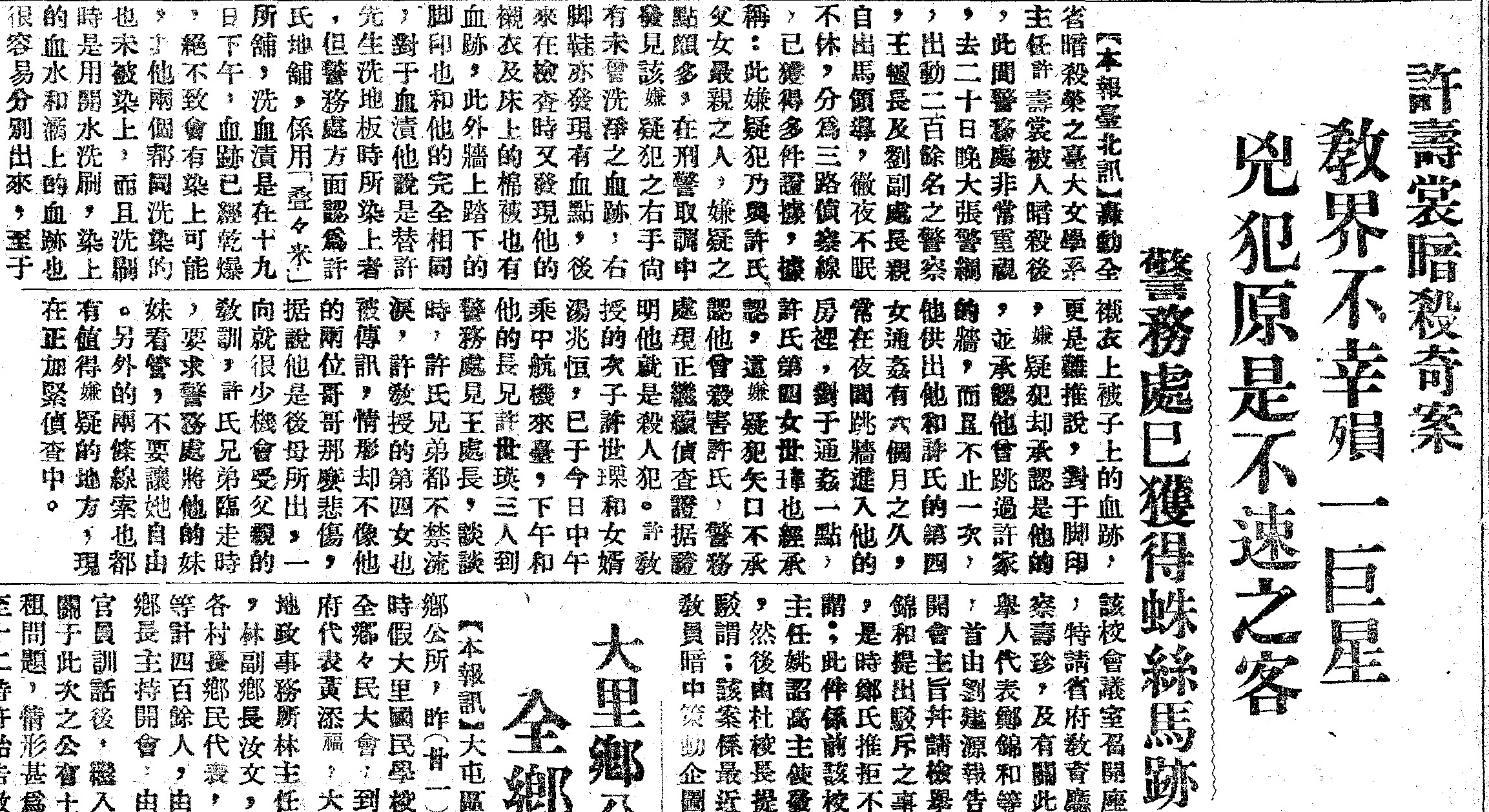 到最後,比較能拿的出手的證據,只剩下兇手遺留在現場的柴刀、屍體上的傷痕、血跡濺灑的方向與門上遺留的雨鞋腳痕。從這些證據中,警方推想許壽裳遇害時應是處於清醒的狀態,且與兇手熟識,可能因為撞見竊案現場而遭謀害。