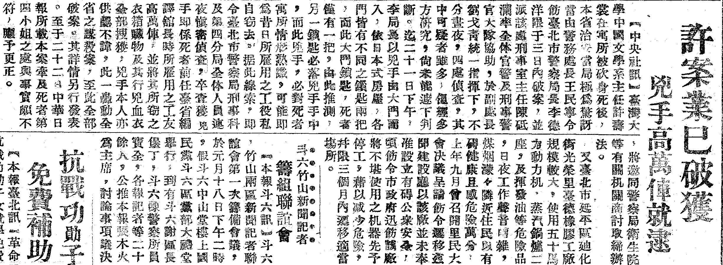 事發當時,台灣省主席魏道明、警備司令彭孟緝,正陪同國民政府副主席孫科赴台南視察。事件一發生,彭孟緝立刻下達了限期破案的指令。而警備副司令鈕先銘、憲兵第四團長張慕陶、省警備處長王民寧、副處長劉戈青、陸遂初、地檢處首席檢察官沙宗棠、檢察官蔡萬田、方宗南、台北市警察局長李德洋等,陸續到場檢視。但缺乏證據保存概念的當局,在案發後並未封鎖現場。親友前往探視的結果,等到刑警到場時,案發現場的蚊帳都已經被擠到掉下來,而殘留在柴刀上面的指紋,則被員警以手拾起,包在報紙裡面。那一點點可供判斷的跡證,就此宣告消失。