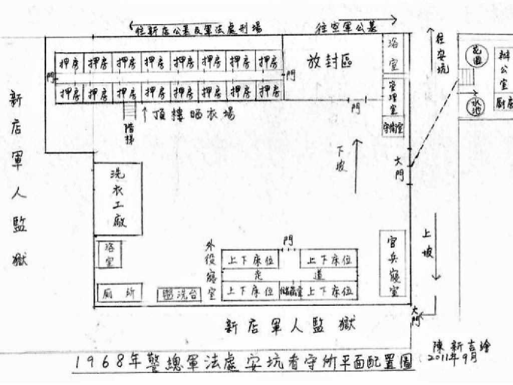 ▲ Floor plan of Ankeng Detention Center of the Military Law Office under the Taiwan Garrison Command in 1968, drawn by Chen Hsin-chi. (Source: Chen Hsin-chi/National Human Rights Museum’s concluding report “Taiwan, Island of Prisons.”)