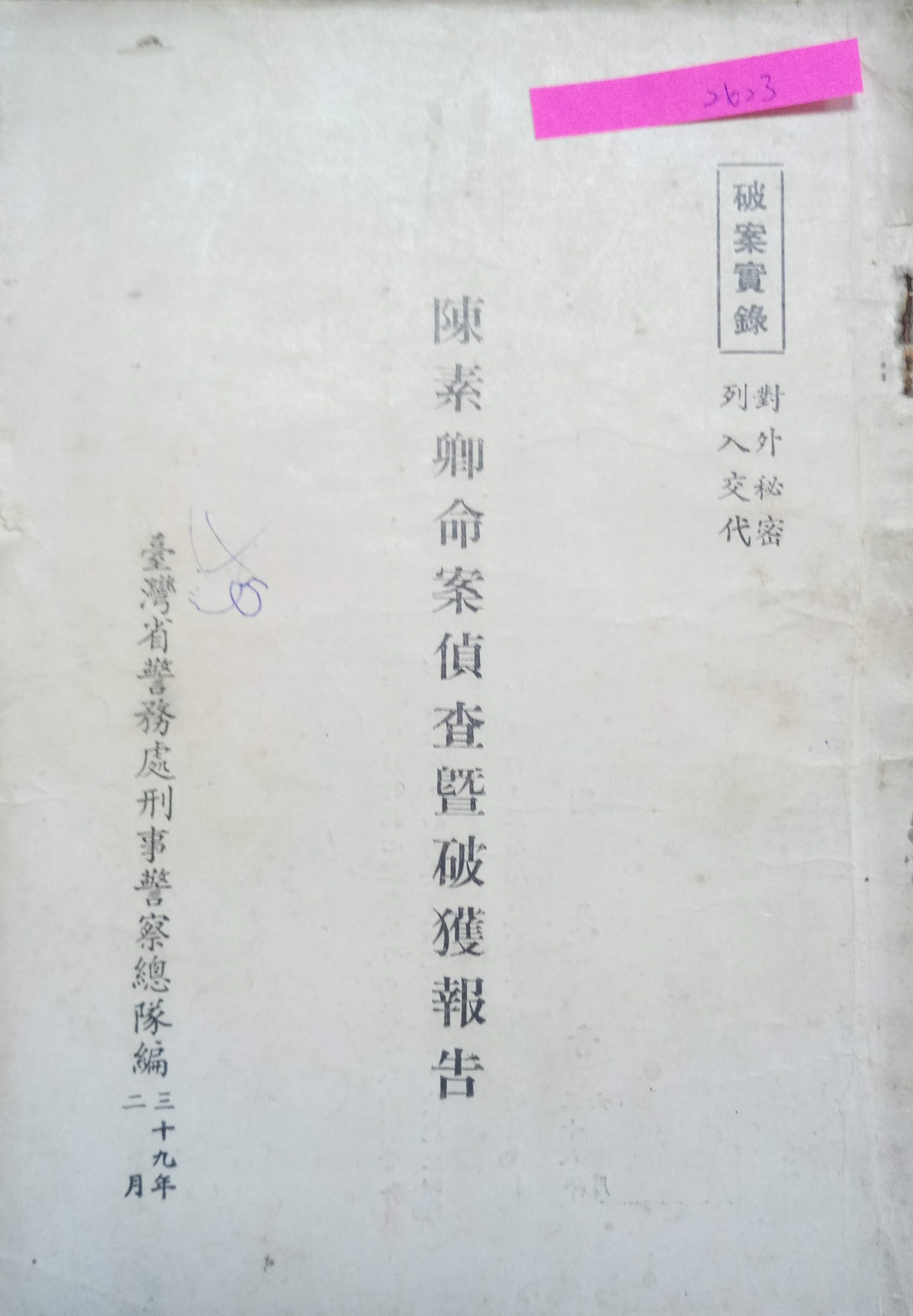 圖片為陳素卿命案偵查報告書影,成書日期為1950年2月,臺灣省警務處刑事警察總隊編,出處不明,攝影者未知,CC BY-SA 3.0,建立於:2019年12月05日。