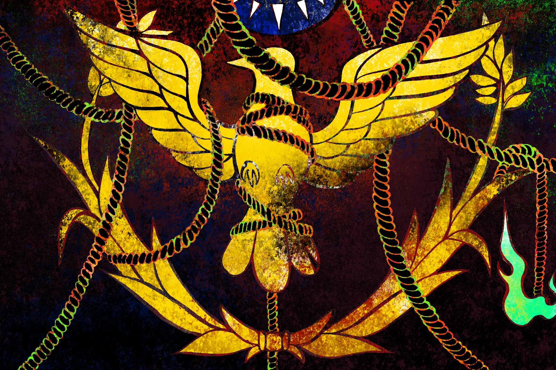 圖片中描述的是代表臺灣警方的鴿子標誌遭到黑金色的繩索綑綁、遮蔽了眼,暗示著湛蓉案背後似乎有著連警方都能隱瞞、阻擋的政商勢力介入,讓整起案件的真相不見天日。