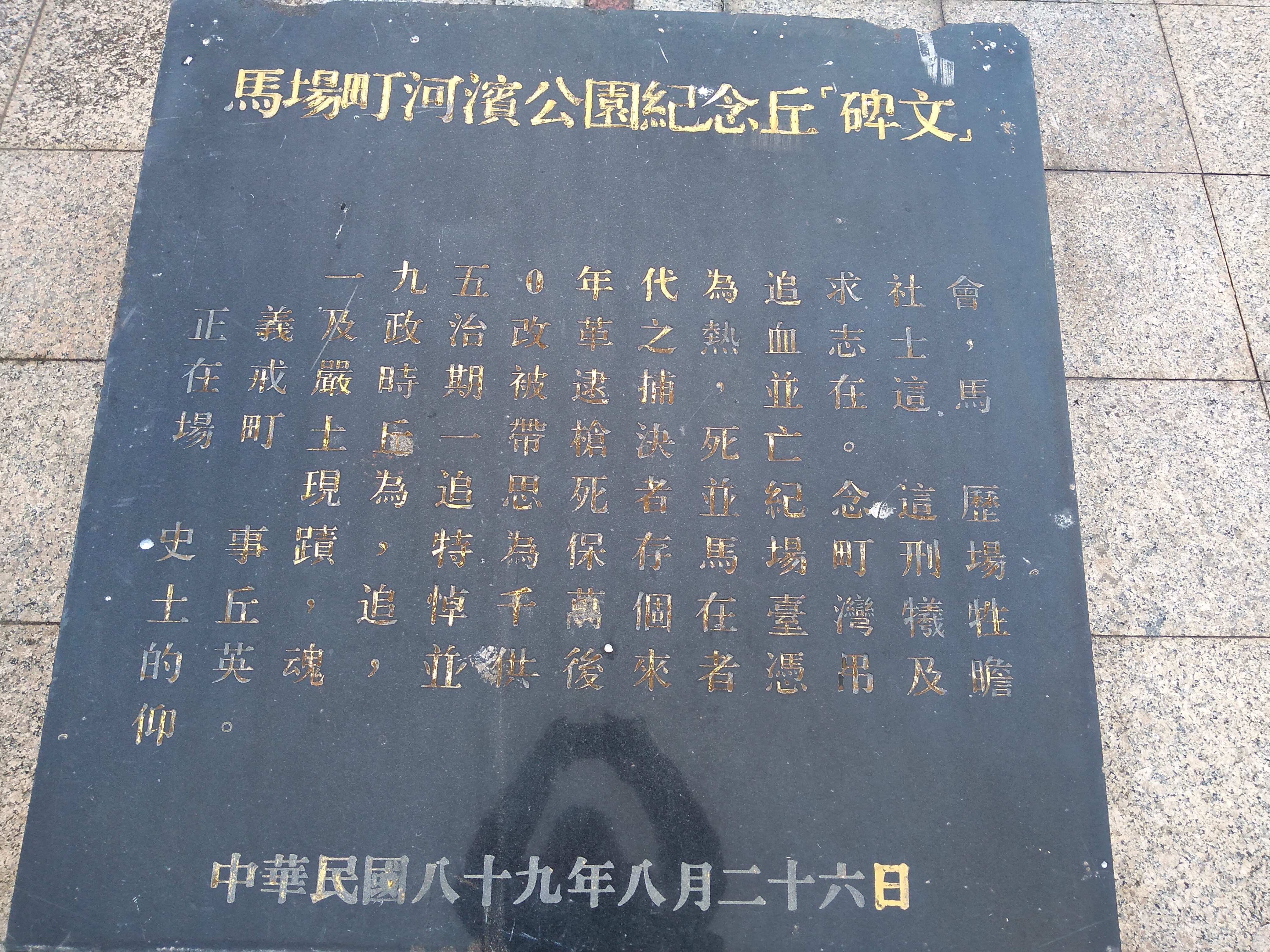 戰後,馬場町由國民政府軍方接管,河邊堤防於1949年5月竣工,堤防外的河灘地遂成為一九五○年代初期白色恐怖大逮捕時期用來槍決政治犯的著名刑場。依現有資料顯示,當時在馬場町刑場負責槍決行刑的部隊應為憲四團,最遲在1949年即有馬場町刑場的槍決紀錄,1951至1953年是執行槍決最密集的時期,1954年逐漸轉由安坑刑場執行槍決。於馬場町刑場槍決的人數難已考證,但推測是執行最多政治犯死刑之處。在馬場町受槍決的雖大多為政治犯,亦處置過搶盜等其他犯行者的死刑案,甚至國民政府內部的官員:何川、李友邦、吳思漢、宋斐如、區嚴華夫婦、郭琇琮、黃溫恭、葉盛吉、鍾浩東、簡吉、黃榮燦、陳儀等人,皆於馬場町遭到槍決。著名的政治案「澎湖七一三事件」、「光明報事件」等相關受難者亦受槍決於此,行刑後無人領回的遺體多送往六張犁亂葬岡。