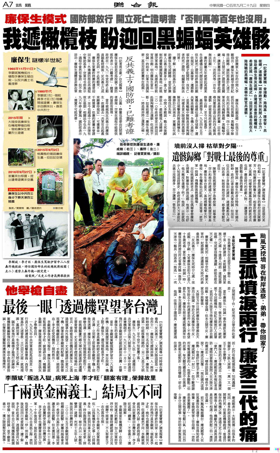 本文係民國105年(2016)9月29日《聯合報》A7版,一則由賈寶楠撰寫,題為〈墳前沒人掃 枯草對夕陽... 遺骸歸鄉「對戰士最後的尊重」〉的新聞。
