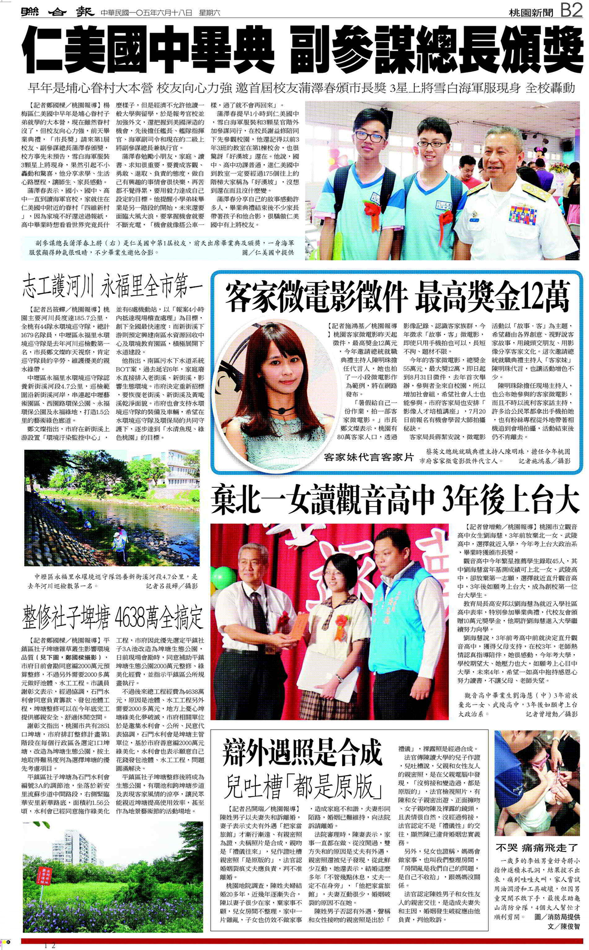 本篇為民國105年(2016)6月18日《聯合報》B2版,一則由鄭國樑撰寫,題為〈仁美國中畢典 副參謀總長頒獎 早年是埔心眷村大本營 校友向心力強 邀首屆校友蒲澤春頒市長獎 3星上將雪白海軍服現身 全校轟動〉的新聞。