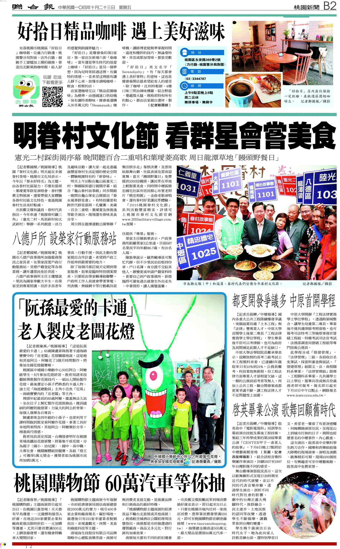本篇為民國104年(2015)10月23日《聯合報》B2版,一則由鄭國樑撰寫,題為〈明眷村文化節 看群星會嘗美食 憲光二村踩街揭序幕 晚間聽百合二重唱和葉璦菱高歌 周日龍潭草地「饅頭野餐日」〉的新聞。
