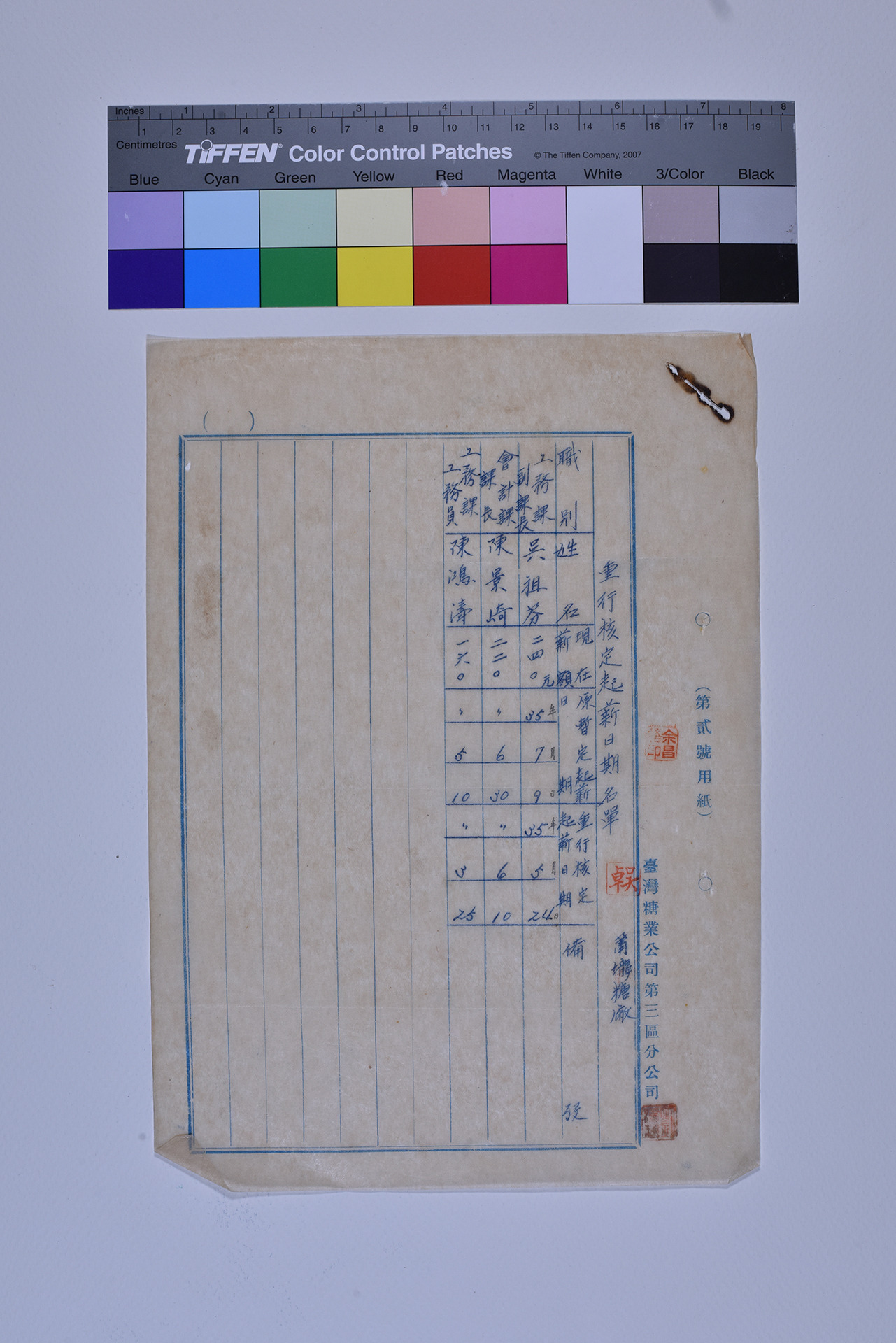 本件為民國36年(1947)2月7日蕭壠糖廠親蕭字第九號公文,為檢發重行核定約聘人員起薪日期名單事由,附件重行核定起薪日期名單一份,並有第三區分公司經理「吳○」印、廠長「余○梧印」、總務課長「蔡○」印、會計課長「陳○琦」印。公文紙右側印記「台灣糖業公司第三區分公司」。