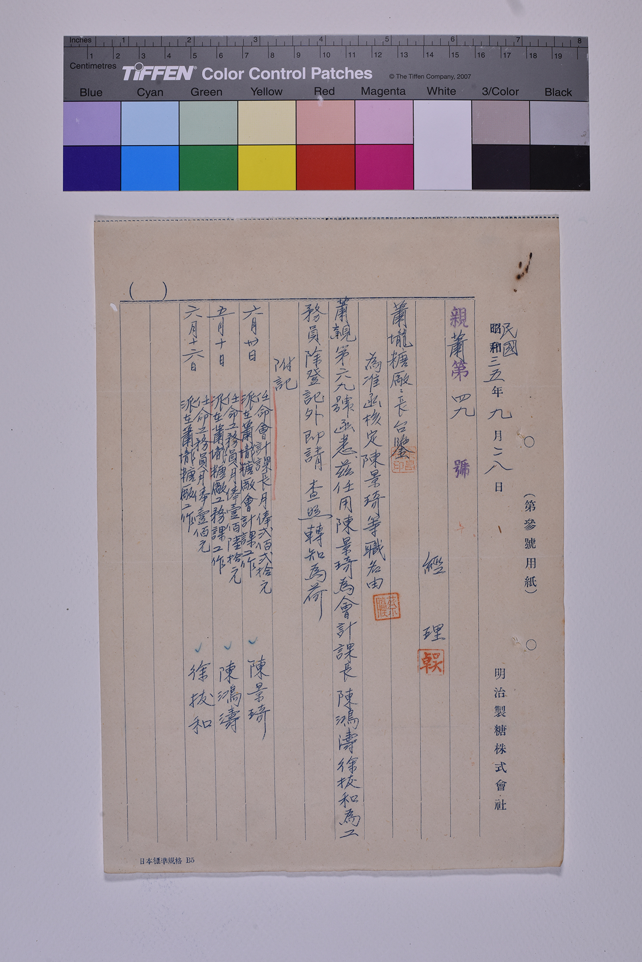 本件為民國35年(1946)9月28日蕭壠糖廠親蕭第四八號公文,為准函核定陳○琦等職名事由,說明任用陳○琦為會計課課長、陳○濤、徐○和為工務員。附記三人的任用日期、薪俸、任職單位級工作內容。並有第三區分公司經理「吳○」印、廠長「余○梧印」、總務課長「蔡○」印。公文紙右側印記「昭和年月日」、「第參號用紙」、「明治製糖株式會社」。文件使用明治製糖株式會社時期的用紙,但時間卻寫中華民國的年號,充分反映政權交替過程中的銜接情形。