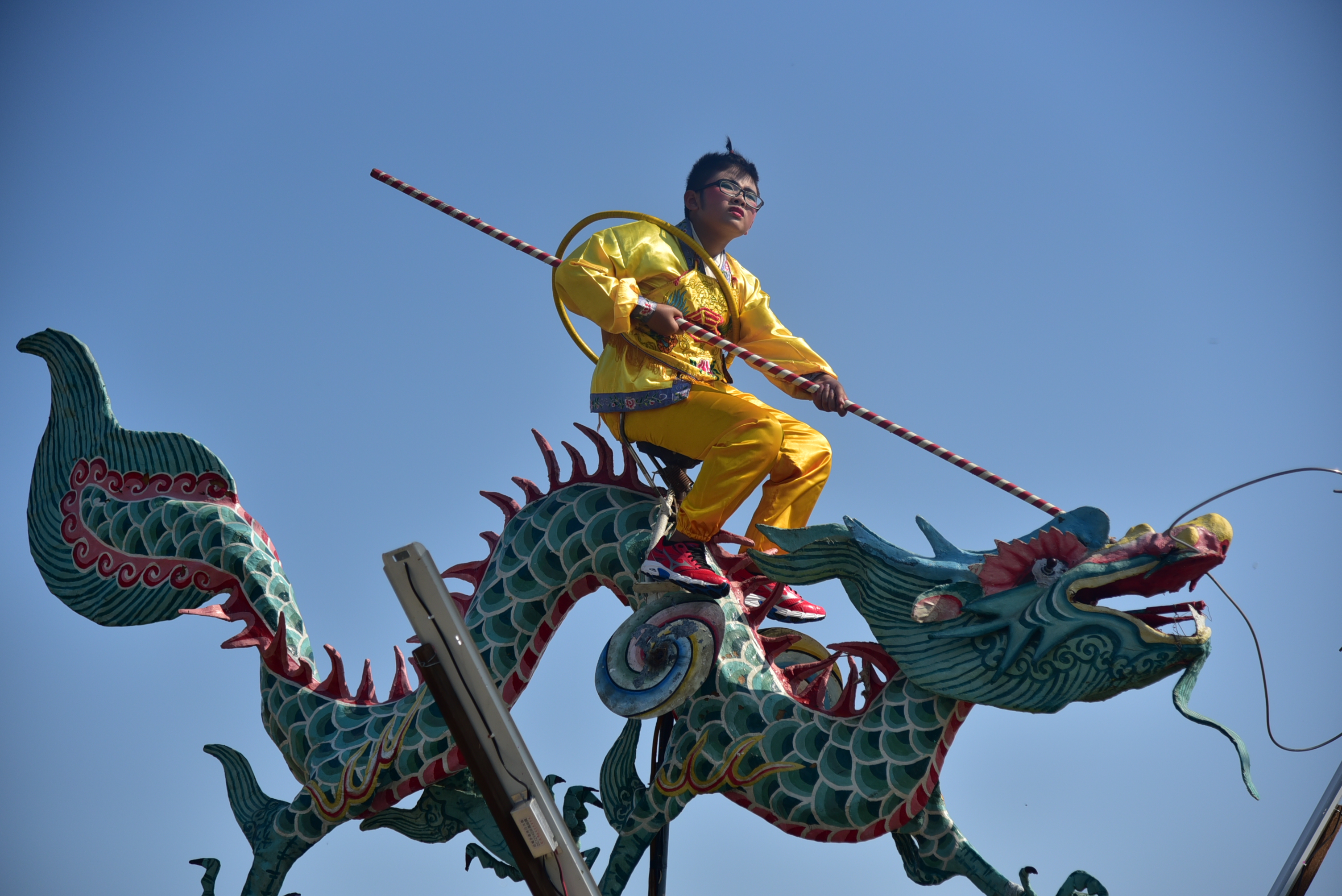哪吒鬧東海為封神演義故事,描述哪吒因打死東海龍王太子而與龍王結怨,在龍王以百姓相逼之下,自盡謝罪,後哪吒在太乙真人的幫助下復活,大鬧東海龍宮制服龍王。此藝閣以農用三輪車搭載,為一個孩童扮演哪吒騎於飛龍之上,造形古樸特殊。