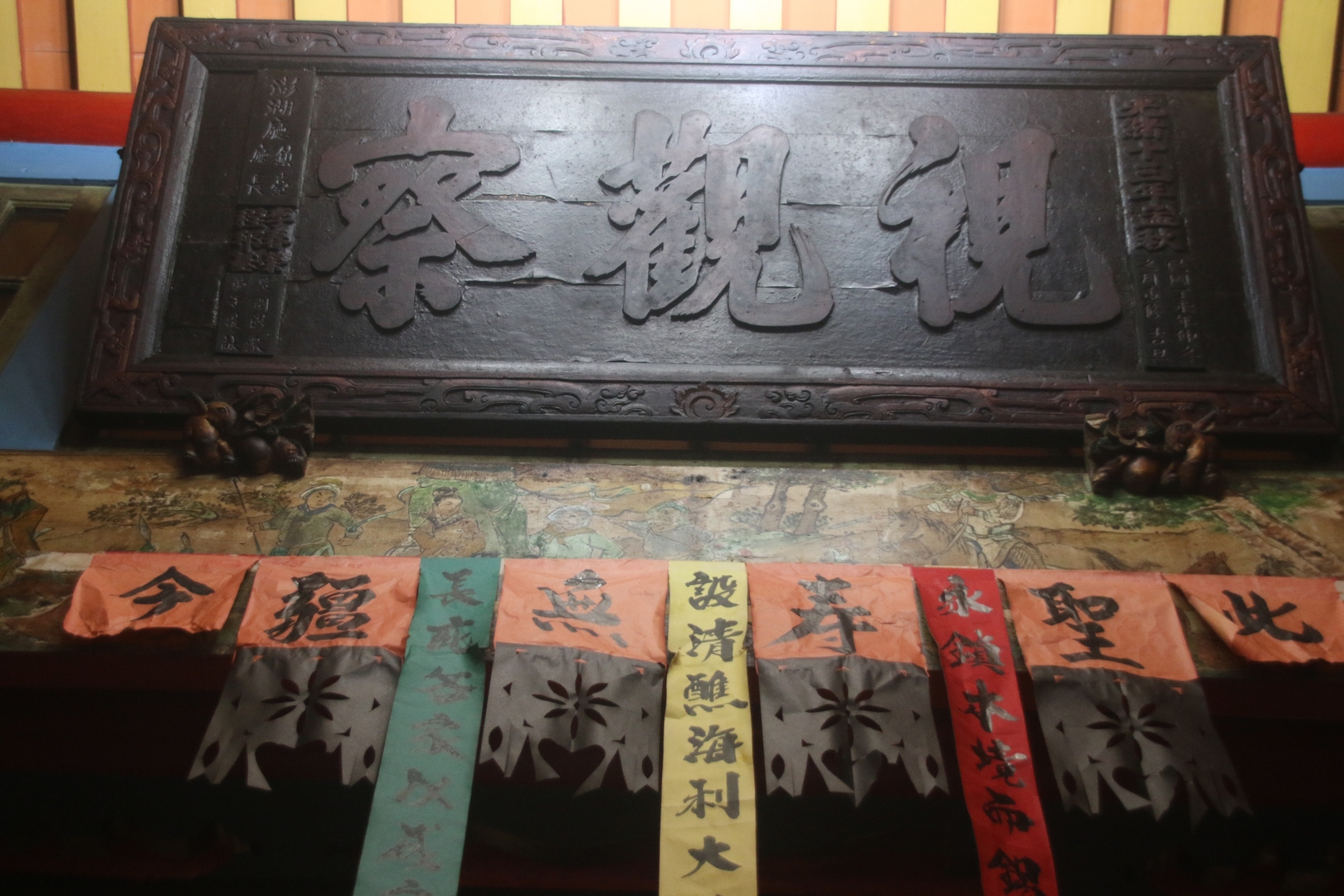 圖片為本團隊成員江昭蓉於2019年12月10日所拍攝,為文澳城隍廟「視觀察」匾額,此匾立於光緒年間。此匾據《硓古石》季刊第41期,篇名為「澎湖文澳城隍廟及媽宮城隍廟史蹟考證」作者吳培基於此文章中說明,上款:「光緒十三年孟秋」,下方註記「民國丁未年仲冬之月重修 吉旦」;下款:「澎湖廳鎮臺李春榮、廳長程邦基」,下方註記「暨閤澎眾弟子敬献」。孟秋為7月,民國丁未年仲冬為民國56年農曆11月,「献」是「獻」的俗字。