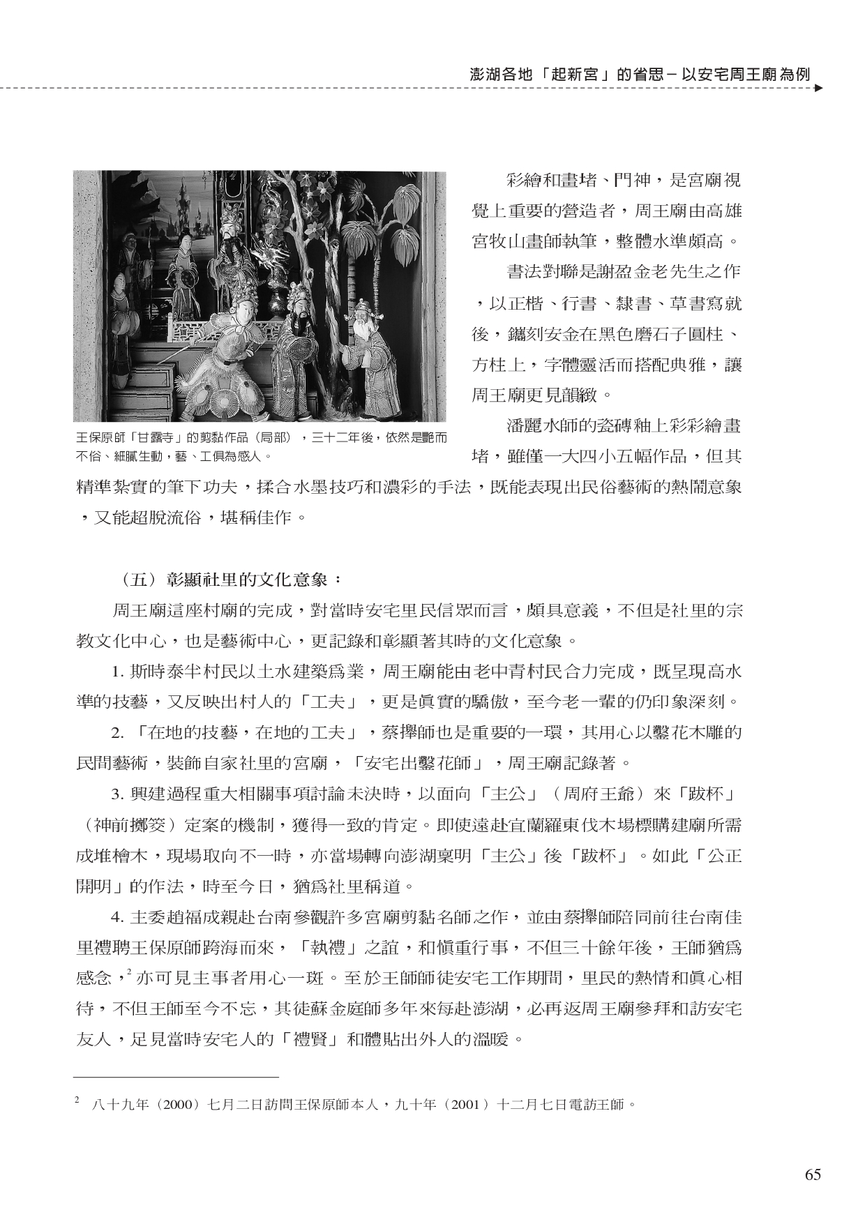 本圖來自《澎湖研究學術研討會論文輯》第二屆之投稿文章「澎湖各地「起新宮」的省思- 以安宅周王廟為例」,照片為「王保原師「甘露寺」的剪黏作品」。。安宅周王廟落成於民國58年,宮廟的興建除了須仰賴名師和技術,在人力方面,當時則是由村民擔任,可謂全村投入;在建築過程中,同時促進了不同世代間的技藝傳承,因此,宮廟的完成對於里民而言是具有重要意義的。民國90年,安宅周王廟因屋頂漏水、地方角力,而在未取得里民的共識之下遭到拆除。有鑑於此,作者提出了幾項能將舊廟與新廟結合的例子,期望地方決議翻修廟宇時,能重視廟宇於歷史、文化、里民心中所扮演的角色:原樣保存與原跡修復、抬高舊廟下建新廟、廟體保留並翻修廟頂和毀損處、石雕與鑿花木雕和石柱結合於新廟中等。