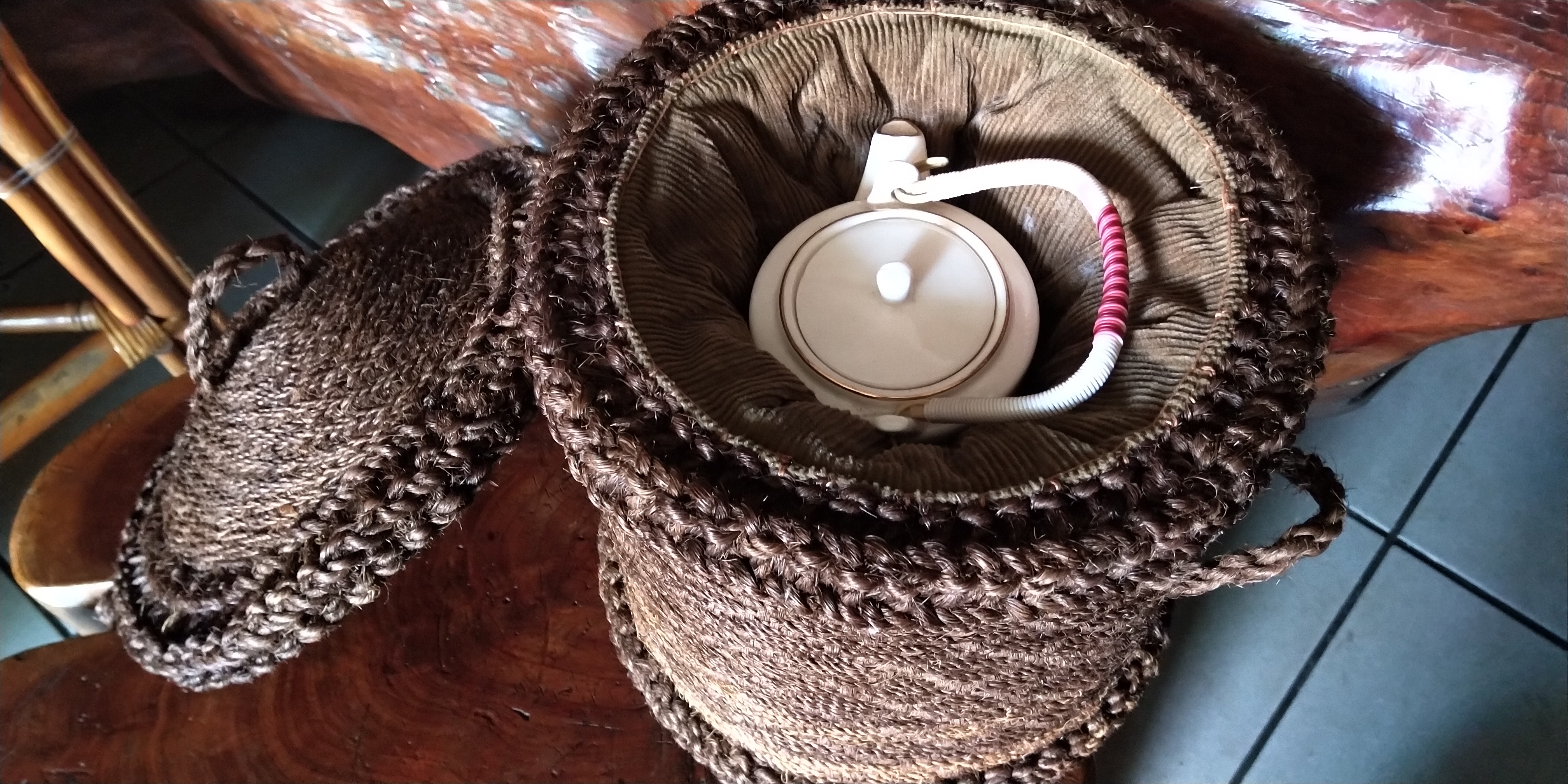 圖片的所在地是關西鎮中正路上,圖中人物是中正路耆老邱創俊,拍攝時間是2019年(民國108年)。邱大哥現年約70多歲(截至2019年12月),年輕時經銷醬油事業,大約20多年前,2007年(民國96年)時到關西農校(現稱關西高中)擔任警衛,當時受到一位老師啟發,而開始寫起回憶錄,寫著寫著,由淺而深,開始記錄地方、人文、歷史等紀錄;就此逐步探討關西鎮近代史。邱大哥,除了是在地文史字典之外,他的手工藝品也是很在行的,毛筆字、木雕、棕梠葉茶壽…等,都很專精;中正路上的67老街客棧招牌,就是出自邱大哥的巧手。(邱大哥轉述),據他所知茶壽來源是從清末大陸流傳至台灣的;清末時期從英國傳來鴉片,那時吸食鴉片大多屬於貴族,以前人家吸食鴉片會非常口渴,加上遇上冬季很冷,所以才有茶壽製作保溫器而成,之後間接流傳至台灣本島。