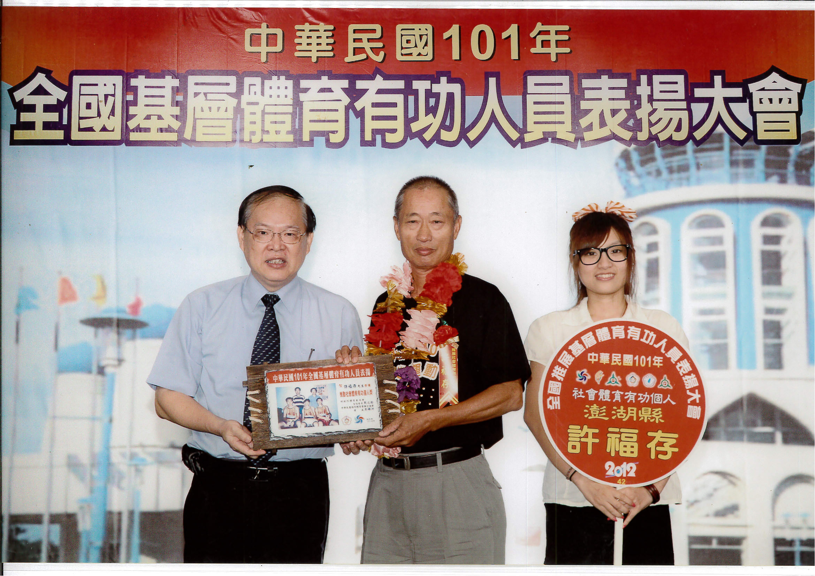 本張照片是1950年出生於澎湖七美、在1990年當選七美鄉長的許福存,在2002年獲頒全國基層體育有功人員殊榮的留影。許福存從年輕時就喜歡運動,進入七美鄉公所任職後,在民國六十幾年當上民政課長後推動舉辦七美杯籃球比賽,一直到今天已經有四十幾年之久。1990年當選鄉長後甚至聯合望安辦理七美望安運動會,帶來二鄉人民之間相互觀摩、學習與激勵的效果。許鄉長的願望,正是希望推動體育活動,可以讓鄉民身體更健康,可以更少使用健保卡看病。除此之外,過去十多年來,許福存則又因緣際會進入城隍廟擔任總幹事、主委職務,為宗教廟宇事務與鄉親心靈信仰的工作服務。