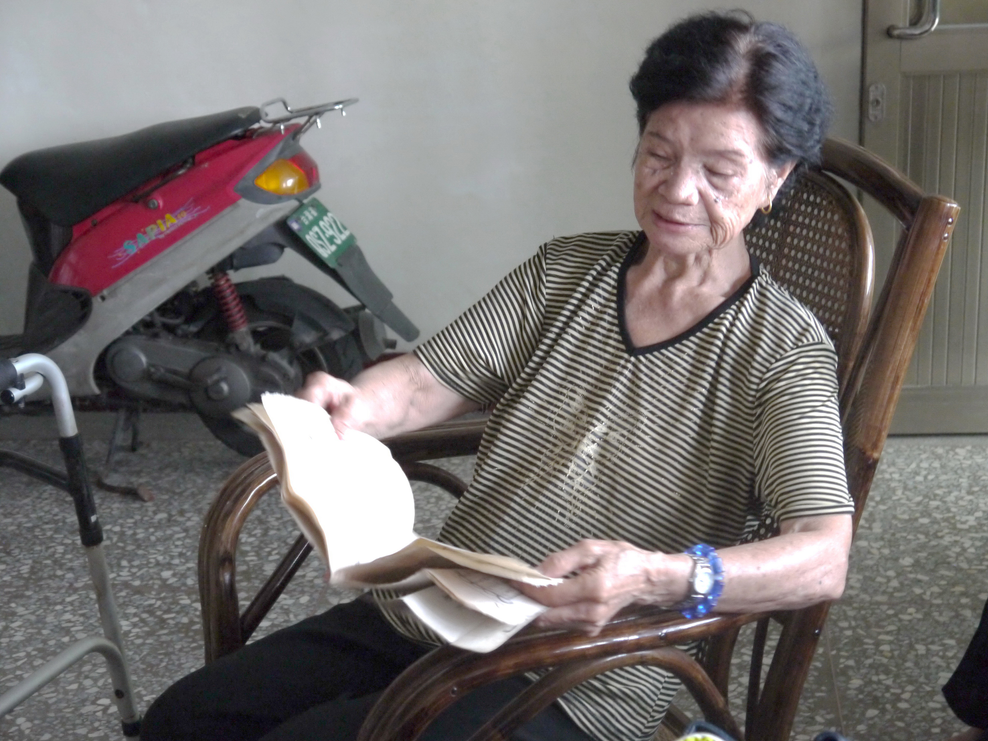 阿樓和先生共育有二子三女,先生過世後,她就一個人獨居生活,因為好人緣,所以友伴也不少,三不五時就有鄰居朋友來和她聊天說話,倒也不寂寞。當我們央求她唸一段歌仔,歌聲響起──「唐朝子儀有名聲,自古至今人傳名。七子八婿真好命,兒孫兩滿透~京~城~」