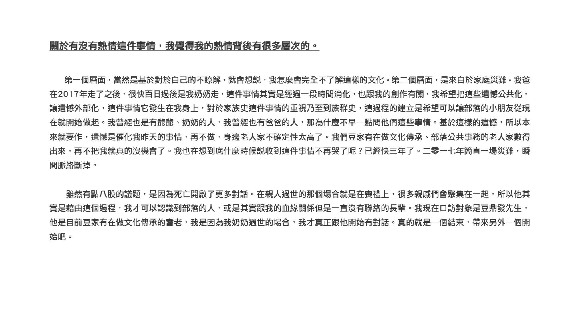 而親人的亡故卻開啟了新的對話,在奶奶喪禮上親戚聚集,藉由這個過程認識到很多人,其中有位與豆豆有血緣關係的家族長輩----豆鼎發先生,是在做文化傳承的家族耆老,在奶奶喪禮上與豆豆開始對話,後來成為現在豆豆的口頭訪問對象,豆豆覺得真的就是一個結束,帶來另外一個開始吧!