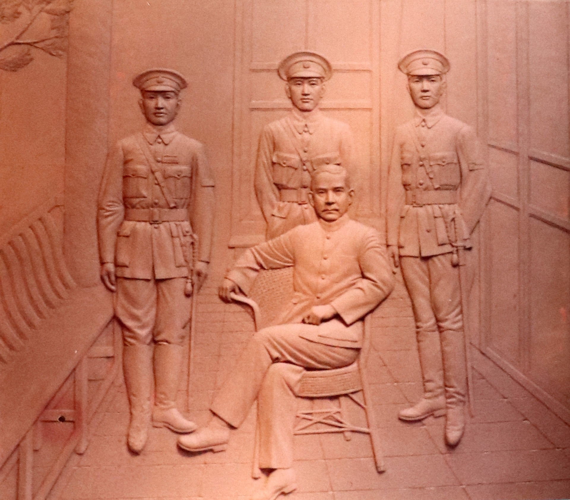 陸軍官校是在1924年由首任校長蔣中正先生所創建,因此位於該校的這件浮雕作品,以刻劃兩位偉人為主,由於該作品面積龐大,幾乎占了整面牆,因此內容上必須避免單調,該作品的前方是國父孫中山先生,以比較輕鬆、自在的翹腳坐姿呈現,站立於後方的共有三人,正中央的是蔣中正先生,另外兩位不知名的隨從則分立左、右兩側,使得該作品在構圖上呈現一個完美的倒三角形,一來不至於只有前後兩位主角而過於單薄,反而變得豐富多元,二來可以讓觀賞者的第一眼視覺,先落在位於下方的國父身上,然後再往上延伸到蔣中正先生身上,讓作品在整體上有了先後的主、從之區別。此作品表現了中國藝術最重視的氣韻生動和行、神兼備,也傳達了兩位偉人身為政治家和軍事家,必須具有堅如磐石、排除萬難的意志力。