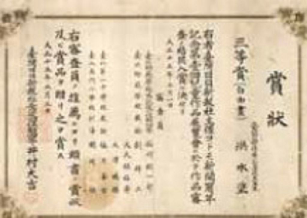 圖昭和1年(1926)11歲的洪水塗在臺灣日日新報社主辦新聞一周年,第1回兒童作品展覽會獲自由畫3等賞狀,展開他的畫歷人生第一步。早在昭和5年(1930),洪水塗就讀新莊第一公學校五年級時,小小年紀便獲此殊榮。這個展覽會評審包括當時有名的畫家兼美術教育者,鹽月桃甫與石川欽一郎,他們也是當時最重要的臺展審查員。洪水塗很早前就是日治時代傑出的藝術家,早年繪畫成績雖然卓越,媲美同時代的繪畫菁英青年,如今後者,如洪瑞麟、張萬傳、陳德旺、顏水龍、李梅樹、范洪甲、呂鐵洲、郭雪湖、林克恭、倪蔣懷、葉火城、楊啟東、藍蔭鼎、李澤藩等人,今日皆已是名揚藝術界繪畫大師,唯多才多藝的洪鎮市長因投身於地方政壇,在藝術創作最巔峰的中壯年時期,大異其趣,反而折衝尊俎於議壇溝通與地方行政領導,擱置了藝術家繪畫創作生涯中最寶貴精華階段,所以他的作品量並不多,彌足珍貴,洪先生似乎成了現代美術界幾乎被遺忘了的一顆明珠。彼時就少人知道這位洪老師、洪議員、洪鎮市長生平獨具美術特色的專長,在半世紀後,他的繪畫成就居然為傳世之寶。