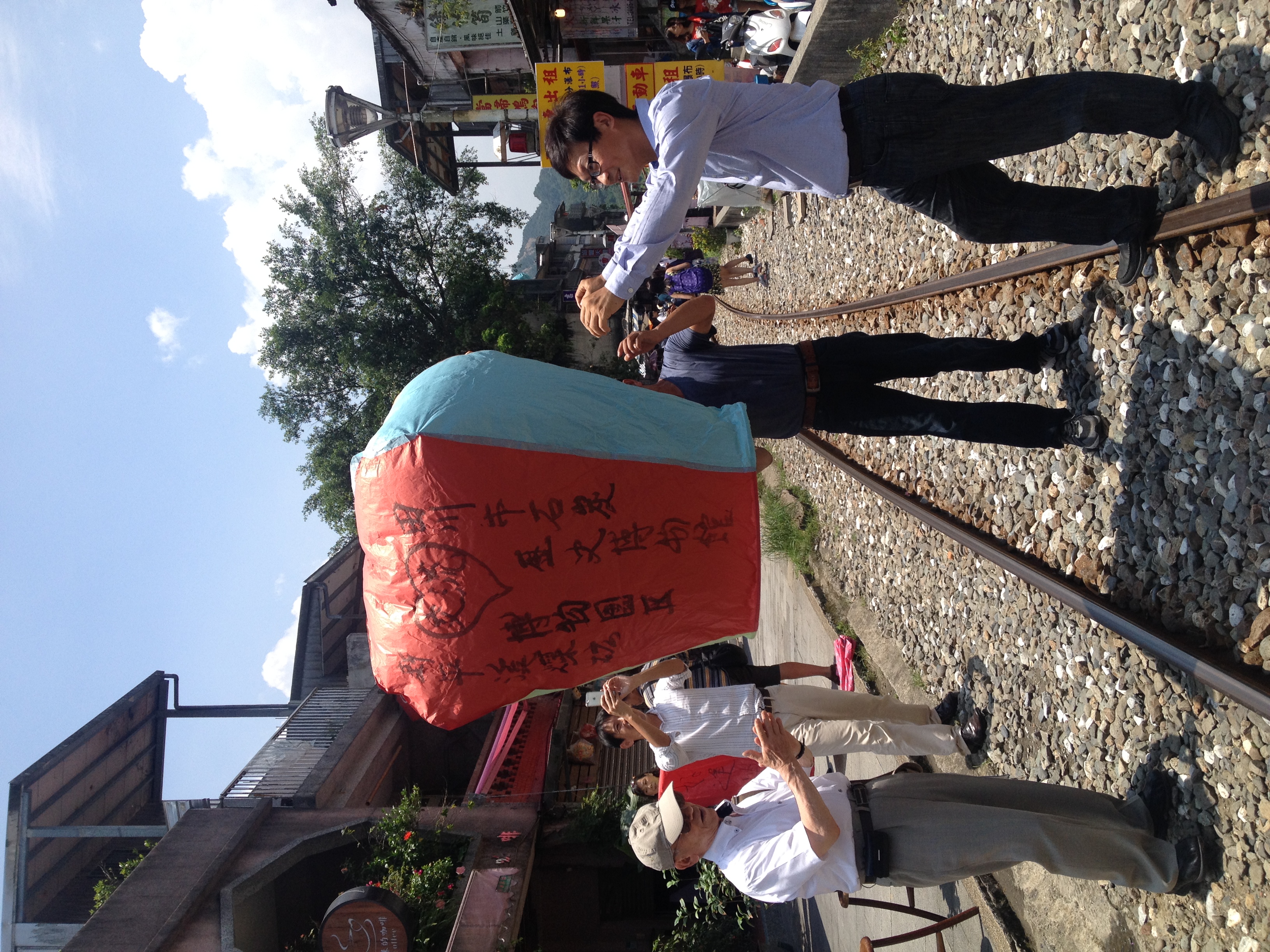 此照片為民國105年由王新衡所拍攝與提供,田川石炭歷史博物館安蘇龍生館長(左一)與新平溪煤礦博物園區的龔俊逸館長(右一),在平溪線的十分車站附近施放天燈,天燈上寫下兩館交流順遂等意涵的祝福。台灣的煤礦文化資產長年透過新平溪園區與日本、歐洲等國際交流下,逐漸建構為台灣與世界煤礦文化合作的窗口。以台日的煤礦文化交流為例,在日本田川石炭歷史博物館的與新平溪園區深度交流下,兩地跨域聯展了台日煤礦文化展覽。新平溪園區每年透過礦工回娘家系列活動,以世界記憶「山本作兵衛炭坑紀錄畫」的展演啟發了台灣退休礦工對煤礦文化保存的意識,同時促進平溪與瑞芳礦業耆老開始以山本畫作的圖文作為煤礦記憶保存之參考依據,因此台日煤礦國際交流對於台灣煤礦記憶保存產生極大的啟蒙作用。安蘇龍生館長是日本煤礦文化保存的前輩,畢生投入煤礦文史保存工作,晚年更是關注於台日煤礦文化交流,順利與新平溪園區簽訂友好博物館協定,為台日煤礦文化保存的交流奠定穩固的基礎。