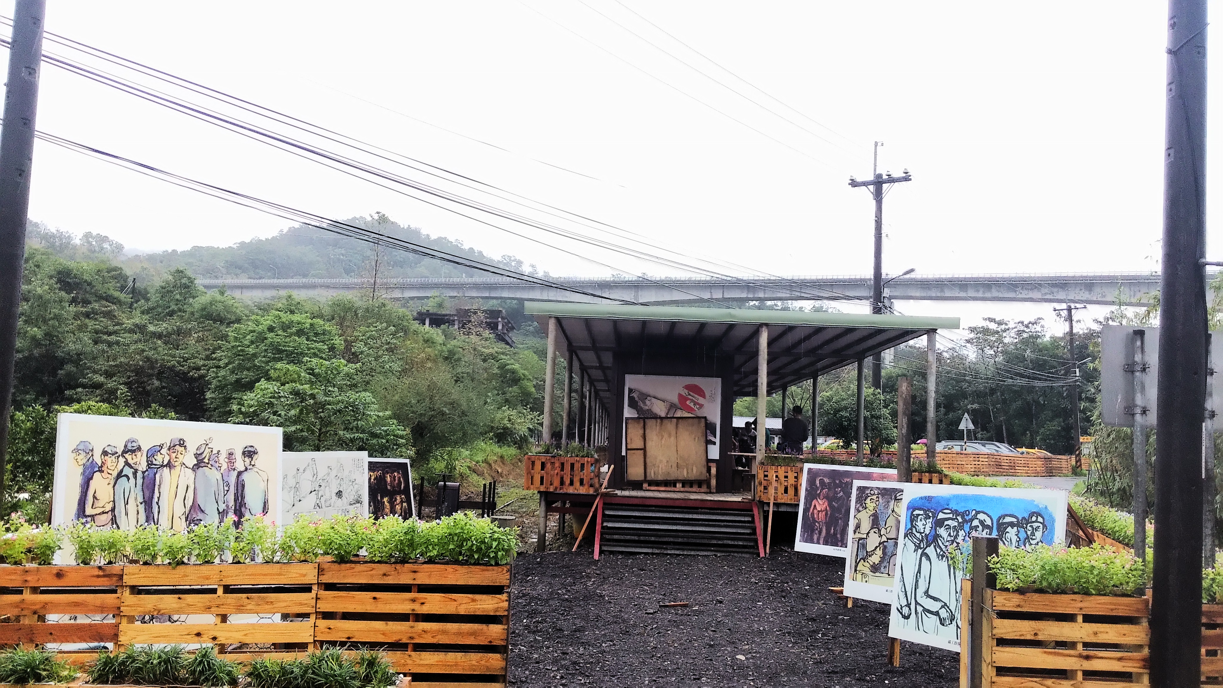 此照片於民國105年10月在新平溪煤礦博物園區的山下選洗煤場廣場所拍攝,由王新衡所攝影並提供。照片呈現在博物館整合協作平台下,新平溪煤礦博物園區、李梅樹紀念館、菁桐礦業生活館三館巡迴展演的展覽情況。整合協作平臺主要是以文化館舍為平臺,結合地方文化資源,深根在地文化保存與發展。三間館舍成為煤礦文化保存地方協作據點,以民眾參與地方文化沃土的培育,來促進文化平權與文化近用權。此計劃亦是新北市政府文化局第一項整合協作平臺計劃,主要目標為煤礦歷史保存、煤業記憶之紀錄,以及煤礦文化的教育推廣。照片可見到本次「煤記憶」特展從李梅樹紀念館所借展的洪瑞麟礦坑畫作,再搭配園區內的山本作兵衛炭坑紀錄畫,妥善地將梅樹月的展演裝置巡迴至新平溪煤礦博物園區展覽,讓工業風格與廢墟性格的煤礦遺址瞬間提升其藝術美學涵養,促使煤礦文化可以更為多樣貌呈現。