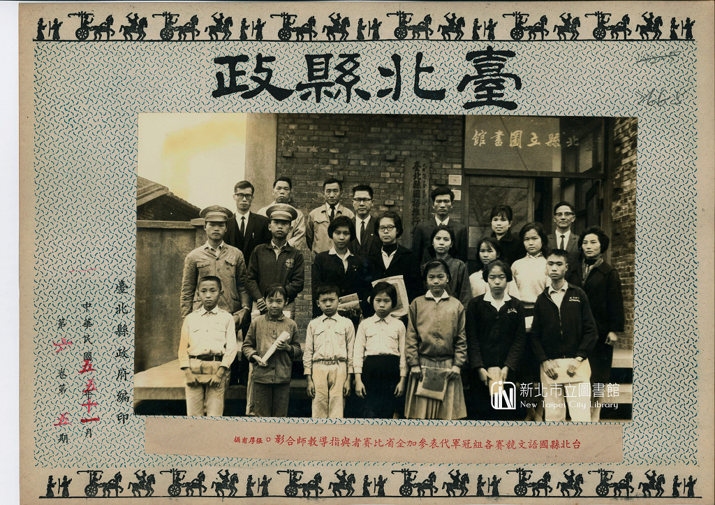 照片為民國55年(1966)11月由張厚甫先生所拍攝,圖中人物為本屆參加台北縣國語文競賽知各組冠軍代表,於比賽結束後,與指導教師於台北縣立圖書館門口合影,當時的圖書館館址位於台北縣板橋鎮文昌街上,為民國52年(1963)興建完工後啟用的新館舍。