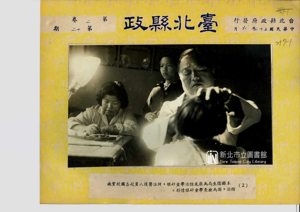 民國52年(1963)6月,台北縣衛生局為徹底防治學童砂眼,特派醫護人員赴各國校實施防治,照片為醫生正在為學童檢查砂眼情形。