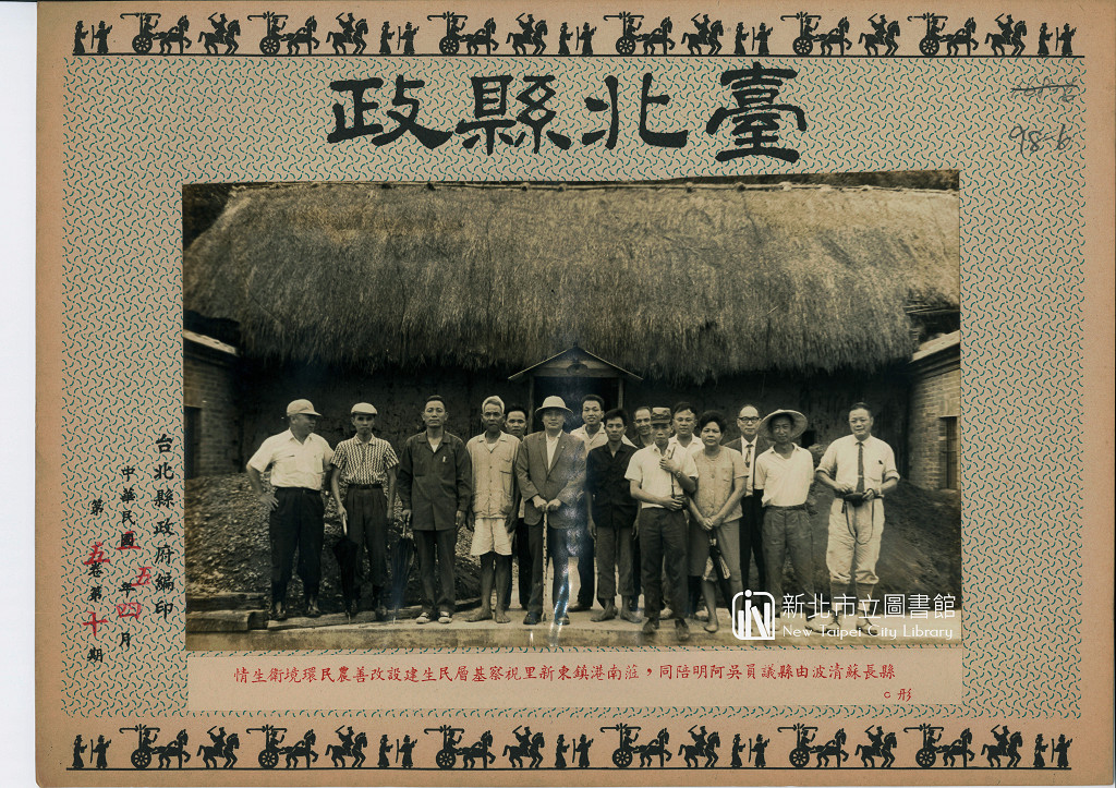 照片為民國55年(1966)4月於南港鎮拍攝,當時縣議員吳阿名陪同台北縣長蘇清波等一行人,前往南港鎮東新里視察基層民生建設,以及改善農民生活環境衛生等情形。參訪結束,大家於農家院子前空地合影留念,可以看到後方的房舍仍為茅草屋頂、泥牆,為一未現代化之早期農村建築。