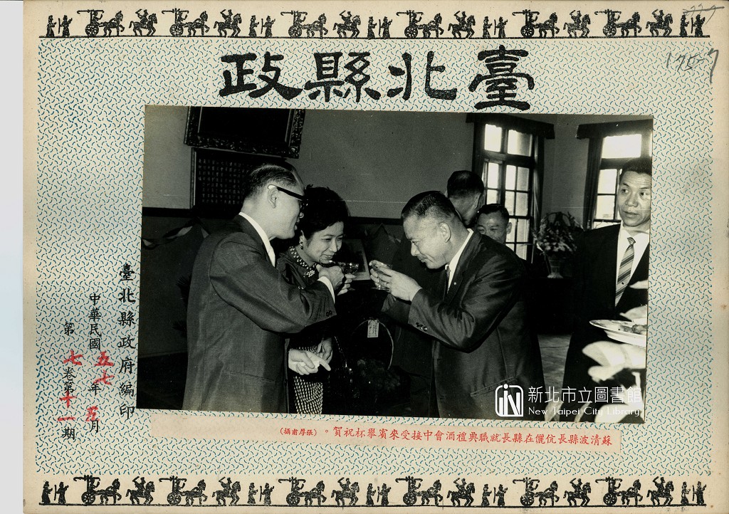 此張照片為民國57年(1968)5月,張厚甫先生於台北縣長就職典禮酒會中拍攝,會場上,可看見角落與牆邊擺放著一籃籃精美的恭賀花籃,而當選本屆縣長的蘇清波先生與夫人王呅女士,正於酒會中一一接受與會來賓的舉杯祝賀。