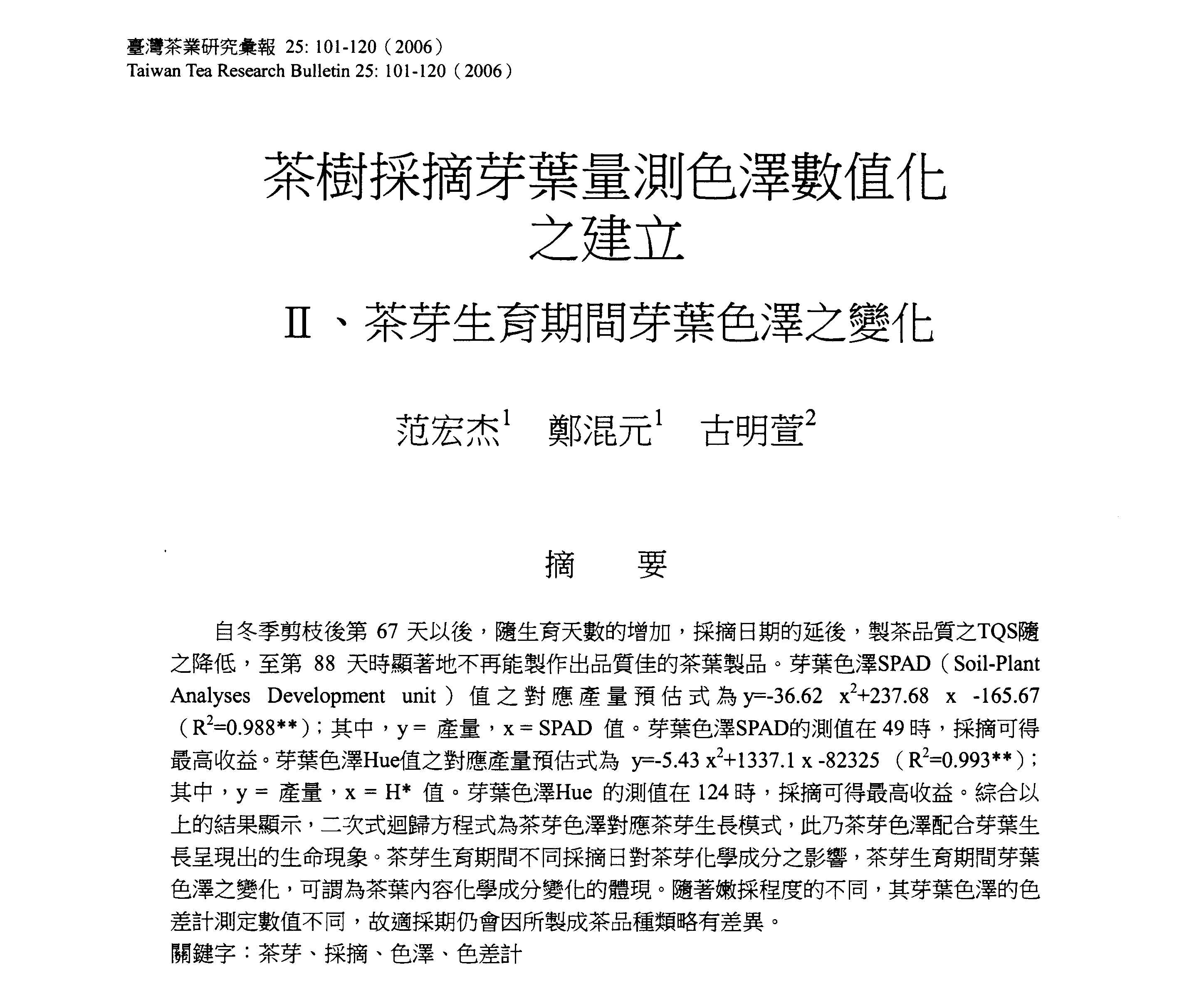 圖為刊載於臺灣茶業研究彙報25卷,由范宏杰、鄭混元與古明萱共同發表之「茶樹採摘芽葉量測色澤數值化之建立 Ⅱ、茶芽生育期間芽葉色澤之變化」研究論文。