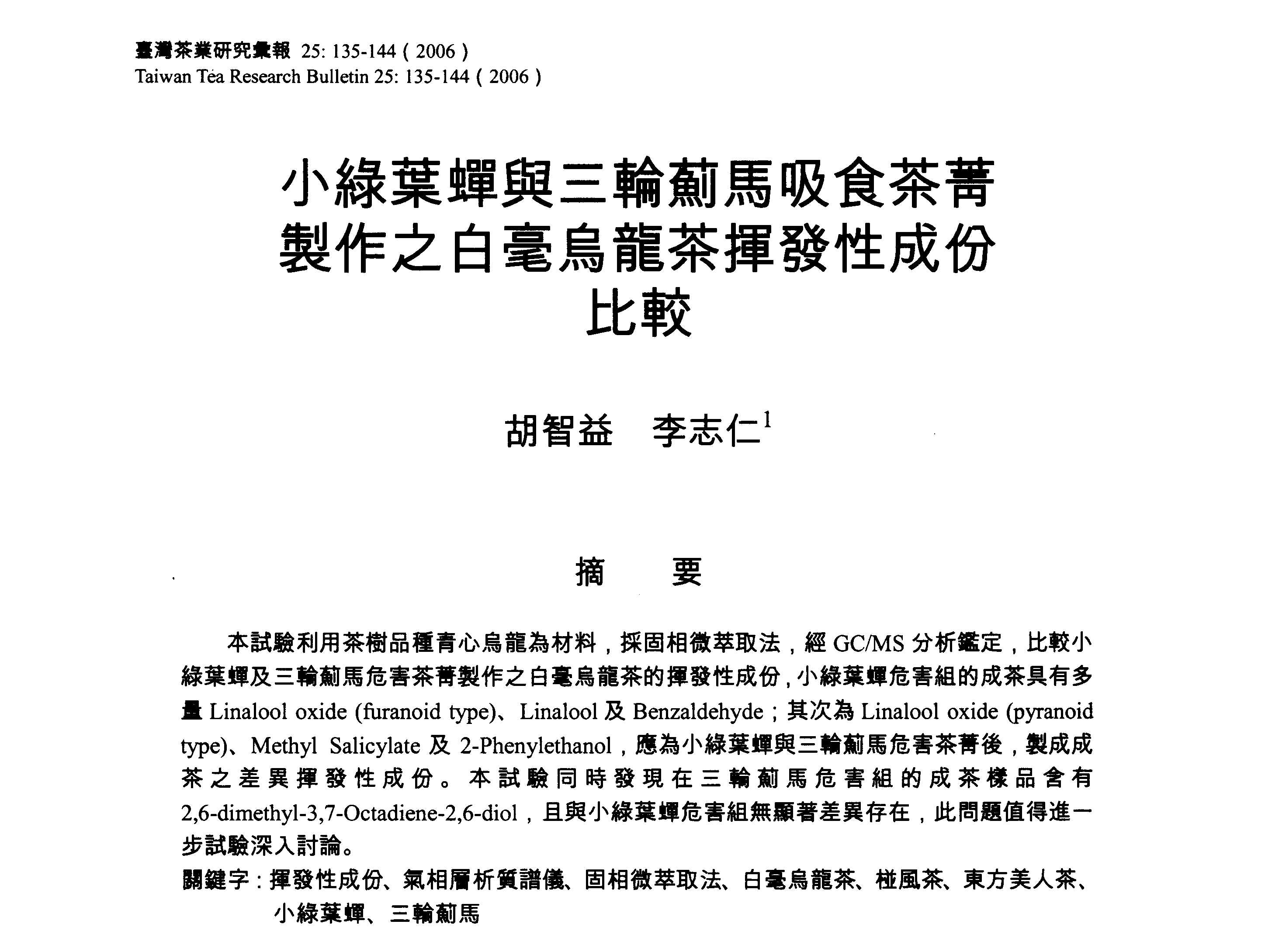 圖為刊載於臺灣茶業研究彙報25卷,由胡智益與李志仁共同發表之「小綠葉蟬與三輪薊馬吸食茶菁製作之白毫烏龍茶揮發性成份比較」研究論文。