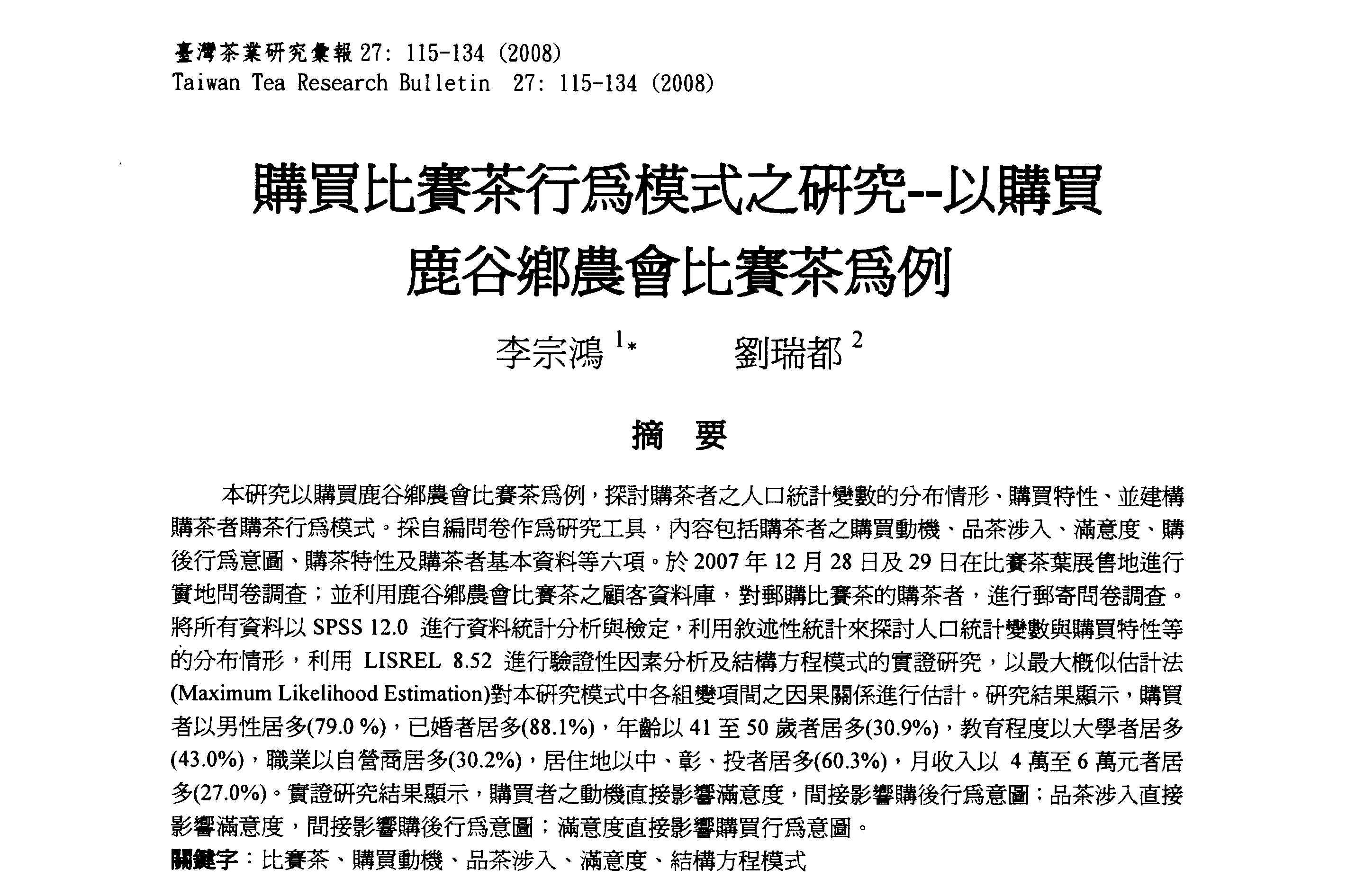 圖為刊載於臺灣茶業研究彙報27卷,由李宗鴻與劉瑞都共同發表之「購買比賽茶行為模式之研究:以購買鹿谷鄉農會比賽茶為例」研究論文。