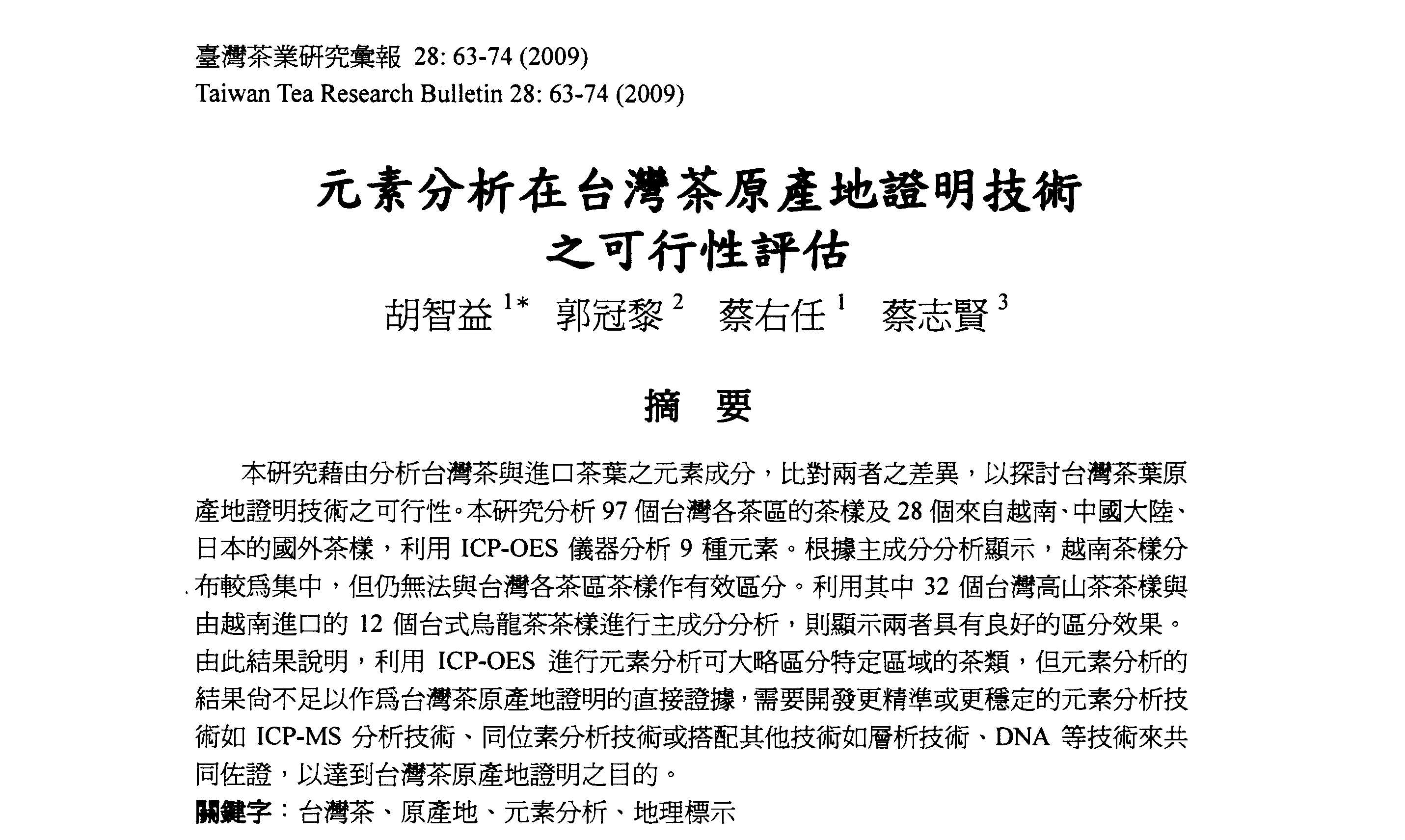 圖為刊載於臺灣茶業研究彙報28卷,由胡智益、郭冠黎、蔡右任與蔡志賢共同發表之「元素分析在臺灣茶原產地證明技術之可行性評估」研究論文。