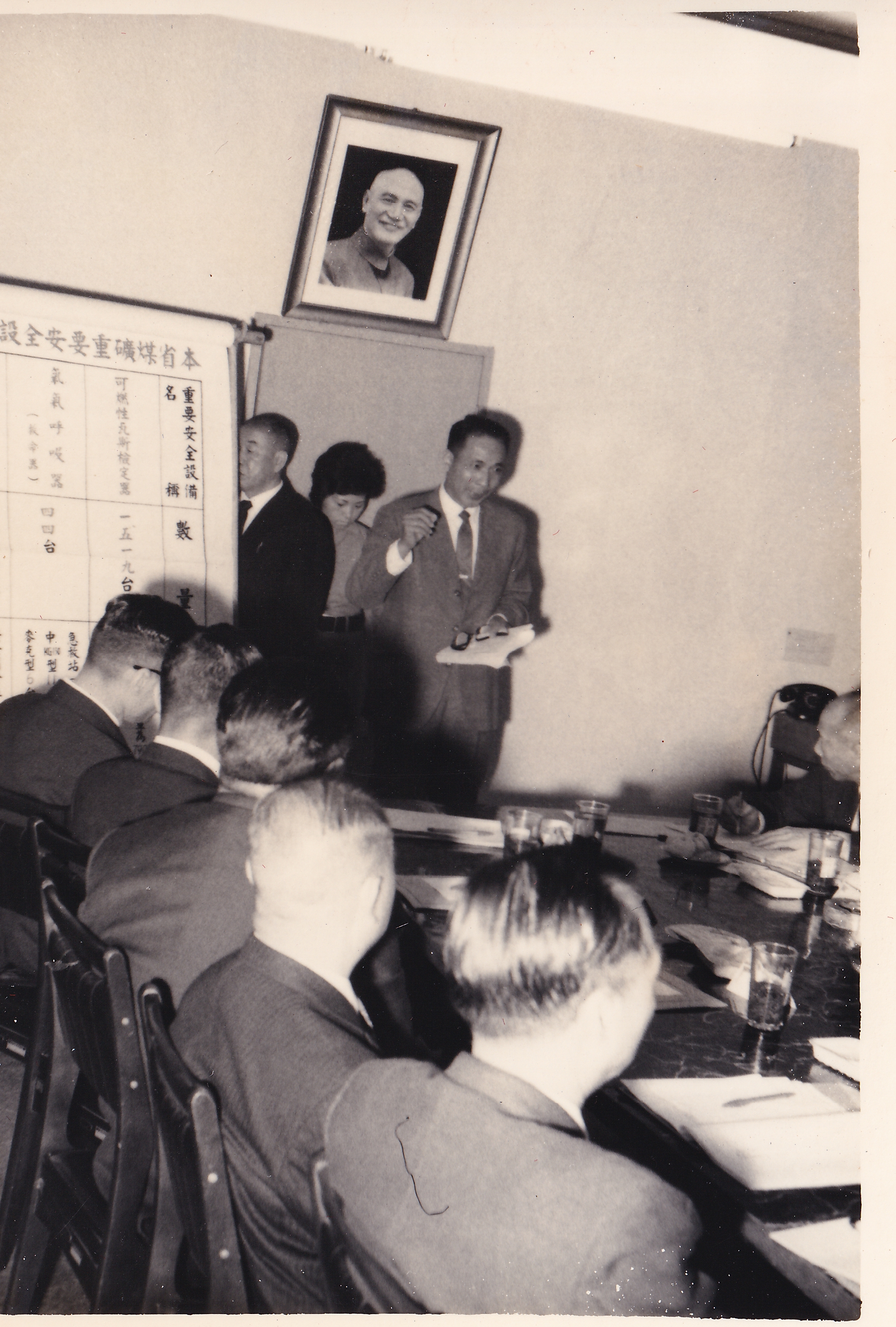 照片拍攝於民國61年,地點為新北市瑞芳區的「瑞芳礦場保安中心」,主要紀錄當時臺灣省議員拜訪瑞芳保安中心,探討瑞芳地區礦場安全管理的會議場景。瑞芳礦場保安中心十分重視礦坑內的毒氣突出,主要是坑內作業時經常遭受各式職業傷害,其中有毒氣體的逸散,常會使礦工在不知不覺之中,遭受瓦斯中毒的傷害,而一般在坑內常見的瓦斯氣體,可以分為沼氣(CH4)、二氧化碳(CO2)、一氧化碳(CO)三種,其中又以一氧化碳,因為無色無味的特點,時常使礦坑中毒時毫無察覺而進而造成極大傷害。鑑此,瑞芳礦場保安中心經常舉辦研討會議,研議如何減少坑內有害氣體的危害。
