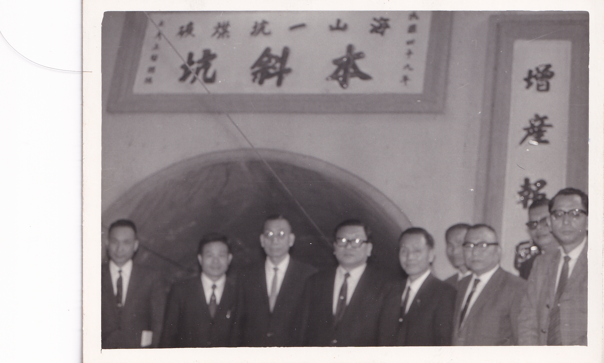 此照片拍攝於民國60年代(1970年代),地點為新北市三峽區的海山一坑,主要紀錄當時的臺灣省議員拜訪海山一坑的場景,照片呈現陳天賜帶領臺灣省議員於海山一坑本斜坑口合照。此主坑道上方牌匾係是以白漆為底,貼上棕色磁磚拼貼的字體,主要以陽刻呈現「海山一坑煤礦本斜坑」,兩旁則為「民國四十九年七月上旬」開坑之說明。海山一坑煤礦為於新北市三峽區成福里,由於陳天賜經營管理有方,高效率的採煤作業運作,加上員工向心力強,礦場業績一時領先全臺,甚被譽為臺灣的模範煤礦場。海山一坑在掘進工作引進了冷凍水局部冷卻技術,也帶動了臺灣礦坑機械化採煤的成功,但如此高效、先進的礦場,卻因民國73年(1984)起接連發生重大的災變而衰退,不僅改變了臺灣煤礦能源政策,更是中斷了臺灣煤礦業的百年榮景。