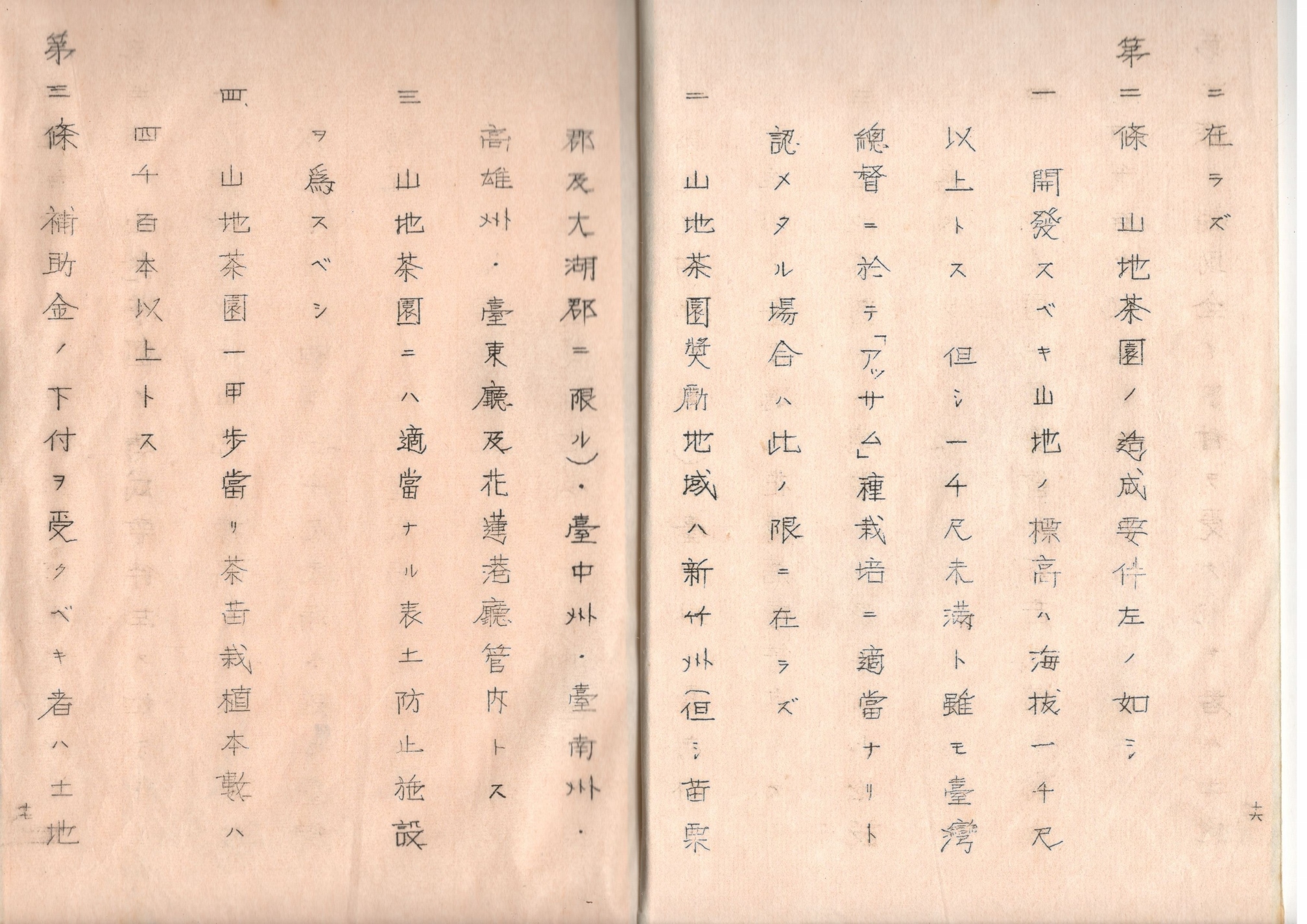一、開發之山地標高要在海拔一千尺以上,但未達一千尺以上,由總督府認定可適合種植阿薩姆種茶樹者不在此限。