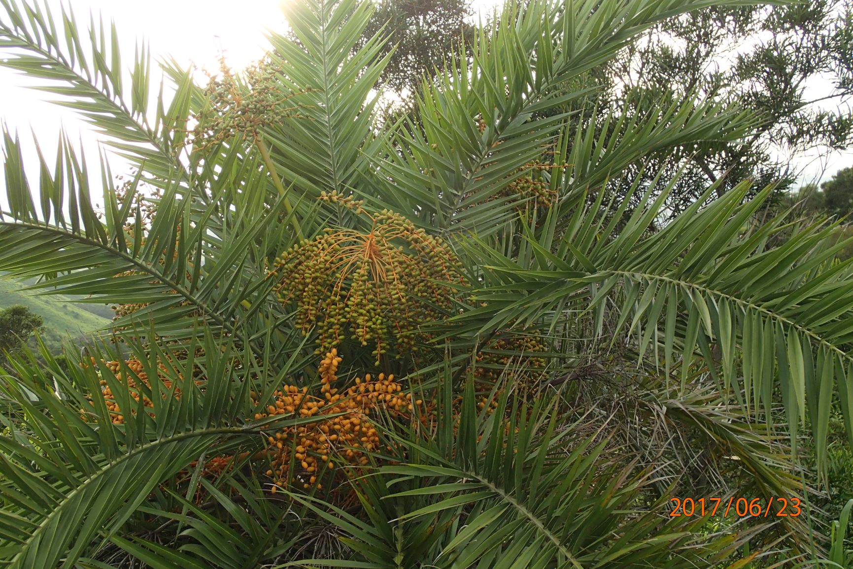 棕櫚科海棗屬。又名台灣桄榔、台灣槺榔。台灣海棗在台灣與台灣油杉、台灣穗花杉及台東蘇鐵並稱為『台灣四大奇木』,均是經歷過上一次冰河期後遺留存在台灣。目前主要零星生長在全台的臨海山區或臨海丘陵地,其中在台灣中部及西南部的淺山丘陵,因屬於台灣半乾旱的環境,適合台灣海棗的生長條件,因此常可見成林的生長,其中大肚山更是在乾溪谷的二側草坡地中,常可見優勢的海棗灌木生長。台灣海棗的樹幹單立,多高能達3~8m,不過因為大肚山一年內強風吹襲的時間較長,故高度到3公尺以上已是非常的大棵,此為大肚山與台灣其他各地型態上最大的差異。幹下部稍細,上部存有枯落葉柄之痕跡,外觀呈疣狀。羽狀複葉,先端頗為尖銳,下方約中數對刺狀,葉柄長20~30㎝。花雌雄異株,肉穗花出自葉腋,雄蕊6。果橢圓形,長約1.2㎝,剛成熟時為橙黃色,最後變成黑紫色。種子橢圓形,具有溝一條。在大肚山早期的年代裡,家中掃地的掃把大多是取材自大自然的植物纖維,其中台灣海棗的老葉所作成的的掃把叫做「糠榔帚」,是十分耐用的清潔工具,而又因其老葉靠近葉柄末端處,小葉常分化成刺狀,固有刺植物在許多山上的耆老眼中,是具有驅邪避凶的功能,因此台灣海棗所製成的槺榔帚,也叫做天地掃,主要是打掃家中神明或祖先牌位的天花板之處。