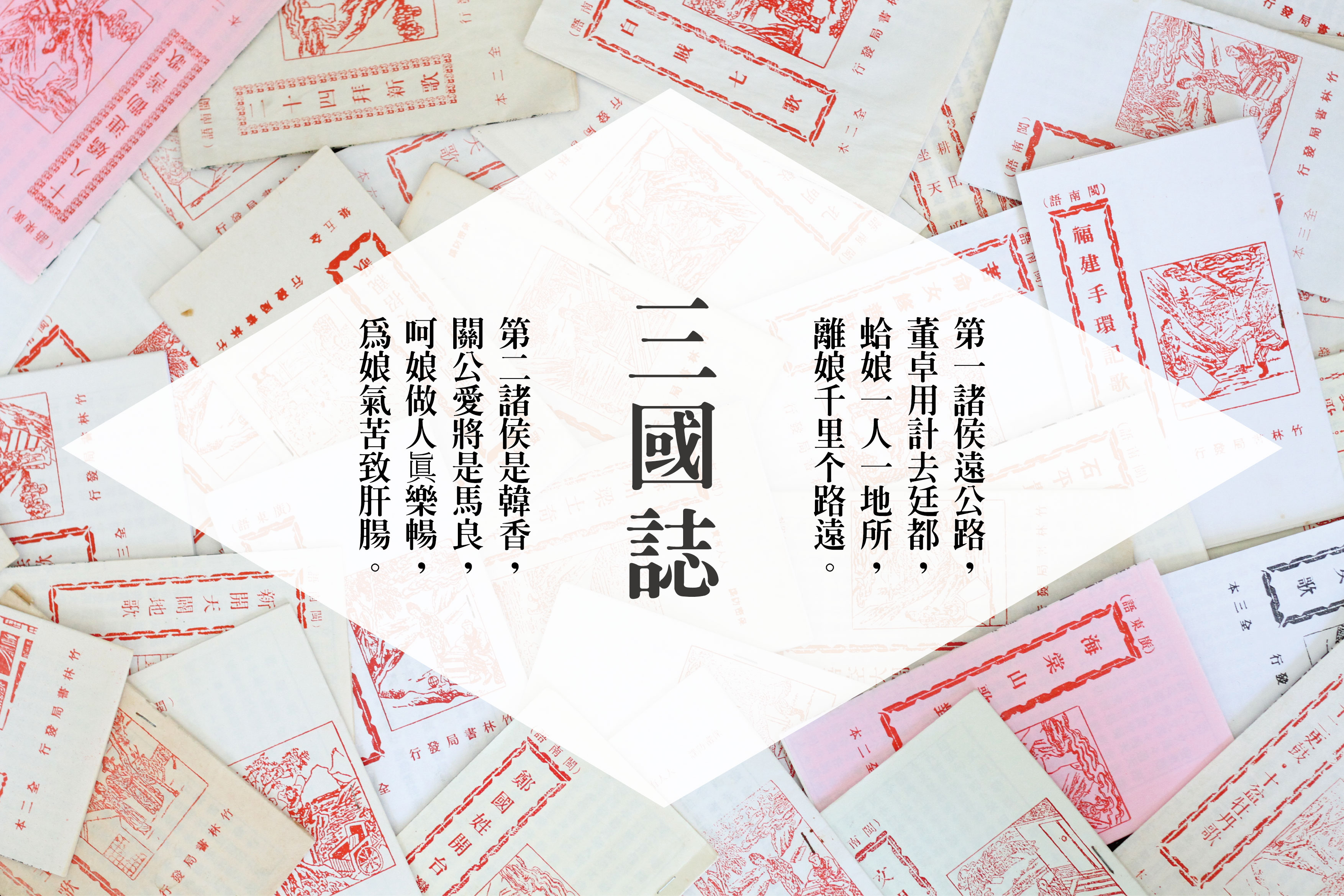 三國誌的題材取自三國時代魏蜀吳的歷史故事,四句聯內容大多改編自羅貫中所撰寫的三國演義,在歌仔冊中是長篇幅故事,歷史人物的部分有:蜀國陣營的劉備、臥龍諸葛亮、幼麟姜維、鳳雛龐統與五虎將(關羽、張飛、黃忠、馬超、趙子龍);魏國陣營則有曹操曹丕父子、鬼才郭嘉、毒士賈栩、虎豹騎的典韋與許褚、五子良將(張遼、樂進、于禁、張郃、徐晃);吳國陣營有孫權孫策兄弟、周瑜、大小喬、蔣幹、黃蓋、呂蒙;其他則有呂布、華佗、貂蟬、董卓、孔融等。除了專門書寫三國故事的歌仔冊,也有些歌仔冊會取材其中幾個三國故事的摘要,放進不同主題的歌仔冊內,如:〈天文地理新歌〉、〈最新三國相褒楊管合歌〉等。