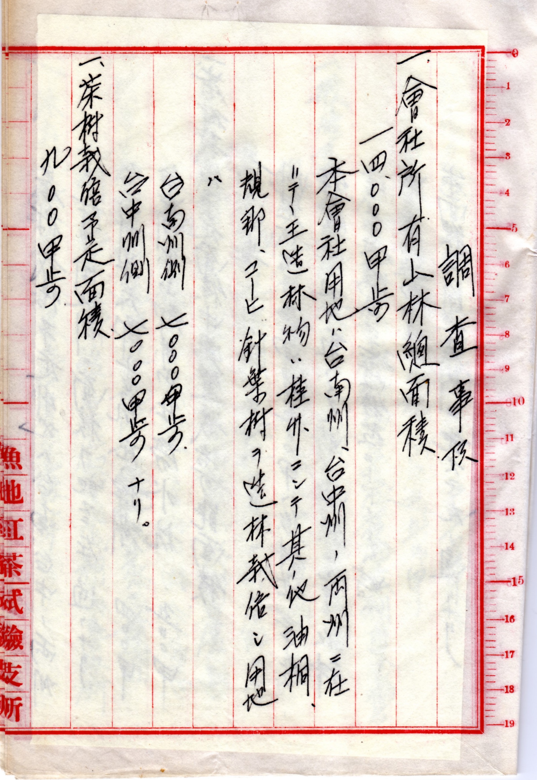 一、會社所有山林總面積14,000甲。本會社用地位在臺南州、臺中州兩州,主要種植造林物及桂竹等,其他如油桐、規那(金雞納樹)、咖啡及針葉樹等,屬造林栽培用地。臺南州方面有7,000甲,臺中州方面有7,000甲。