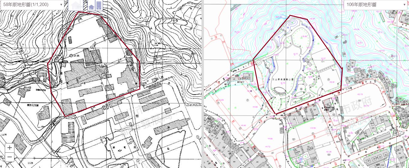 地圖來源:台北市都市發展局網站「台北市歷史圖資展示系統」民國58年版及106年版地形圖